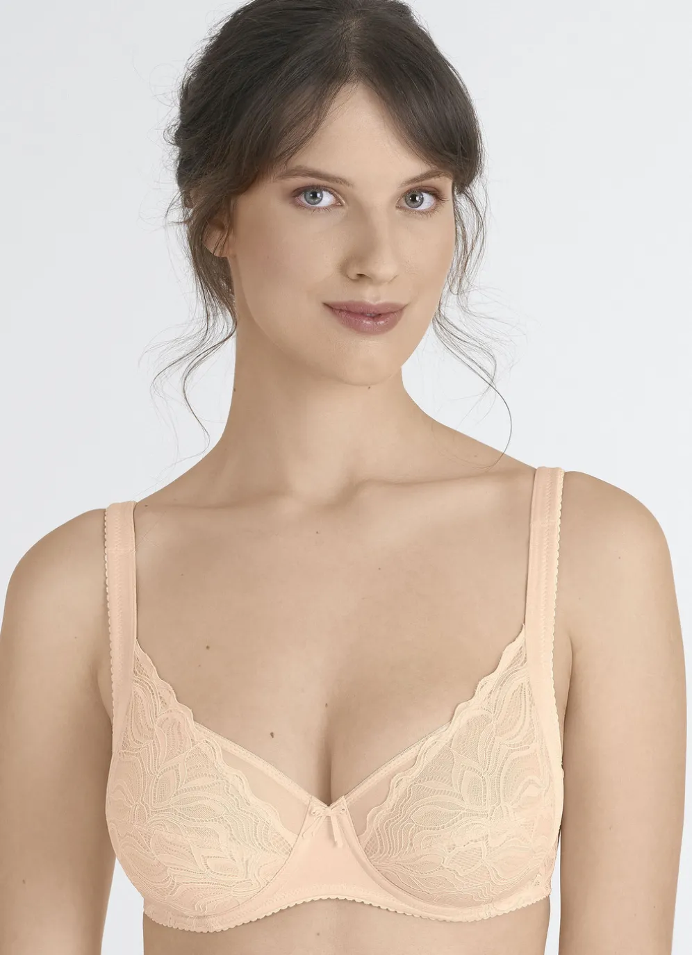 Raffiniert geschnittener „Felina“-Bügel-BH in Zartapricot, mit unterlegter Elastikspitze im Vorderteil, seitlichen Blenden für perfekten Halt sowie verstellbaren Stretchträgern.