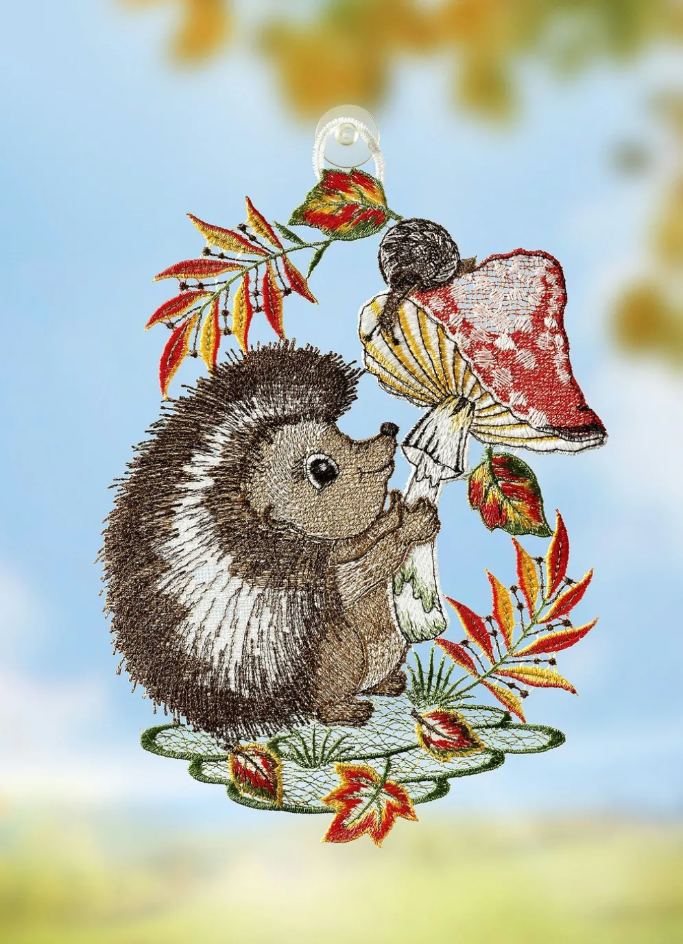 Ein herziger Anblick ist dieses Fensterbild aus echter Plauener Spitze mit dem putzigen Igel und seinem Fliegenpilz. Mit Saughaken zur einfachen Befestigung.
