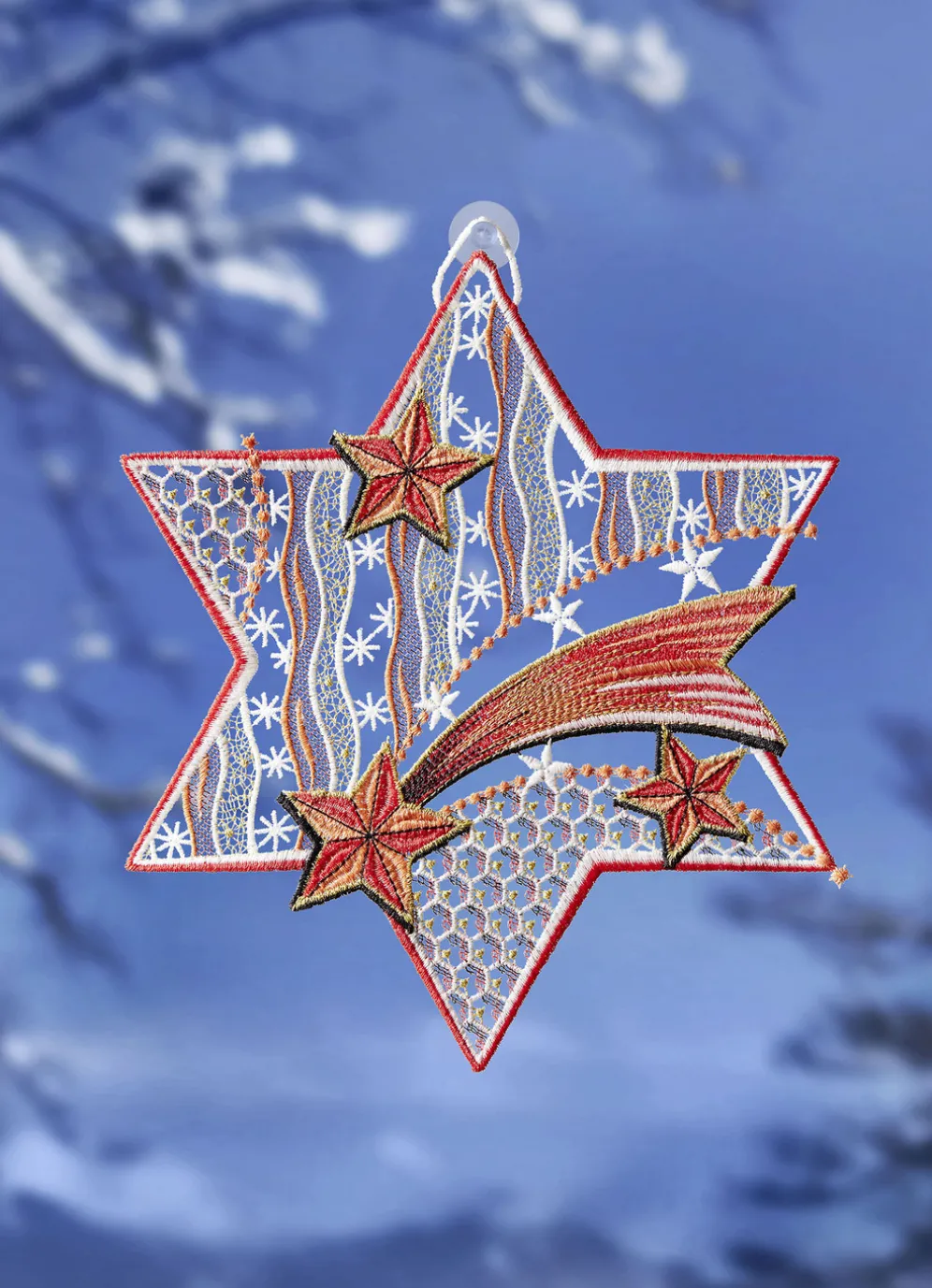 Fensterbild Stern aus echter Plauener Spitze in Rot-Gold.