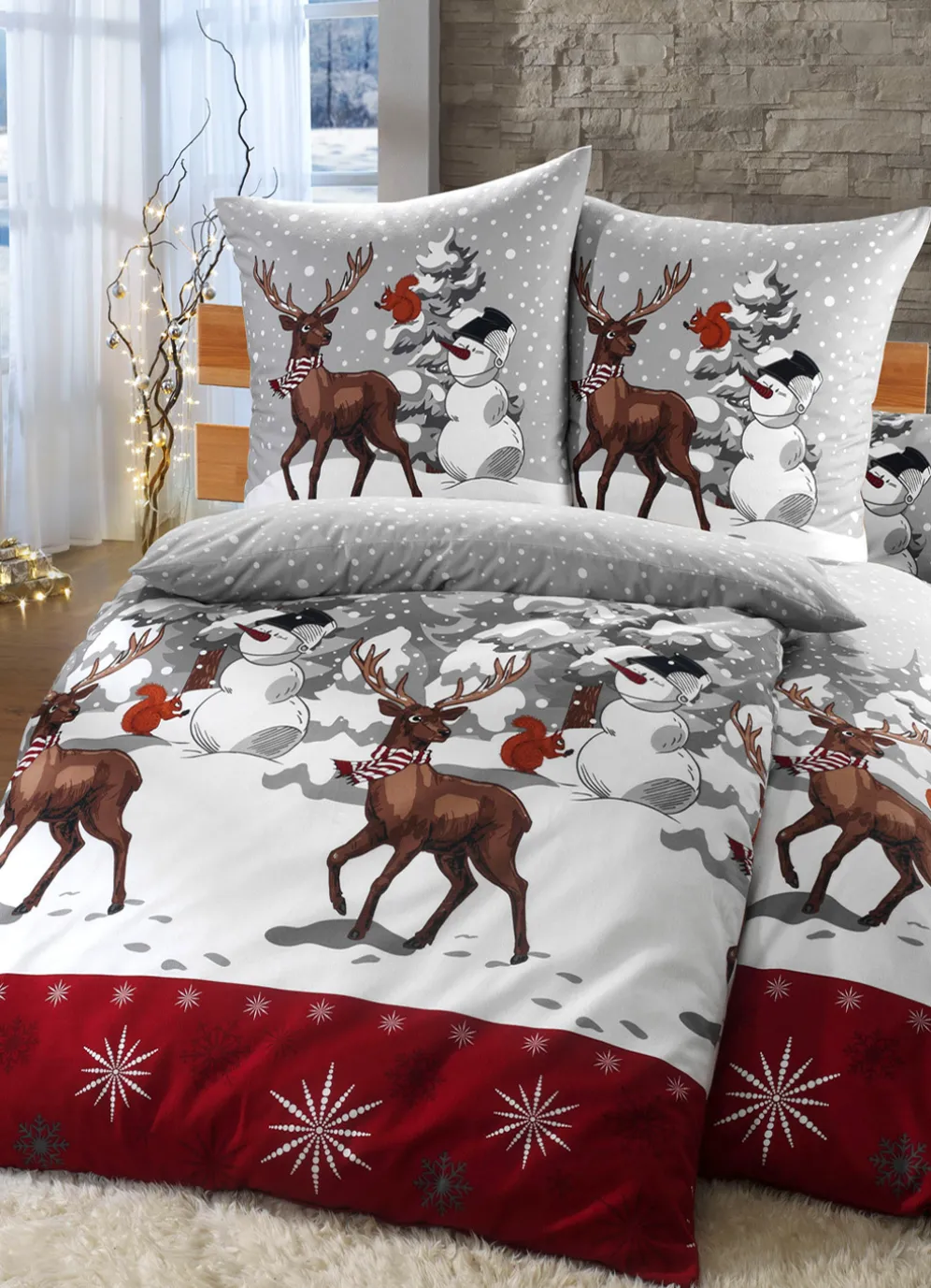 Ein verschneiter Winterwald mit putzigen Waldbewohnern präsentiert sich auf dieser kuscheligen Bettwäsche-Garnitur von Florella. Mit hochwertigem Reaktivdruck und praktischem Reißverschluss ausgestattet. Die Qualität: Soft-Biber aus 100% feinfädiger Baumwolle. Waschbar bis 60 °C