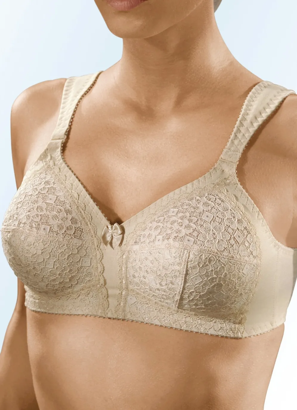 „Format“-BH in der Farbe Haut, mit unterlegten Spitzencups, seitlichen Stützstäbchen sowie im Schulterbereich breiten, weich gepolsterten, verstellbaren Stretchträgern.