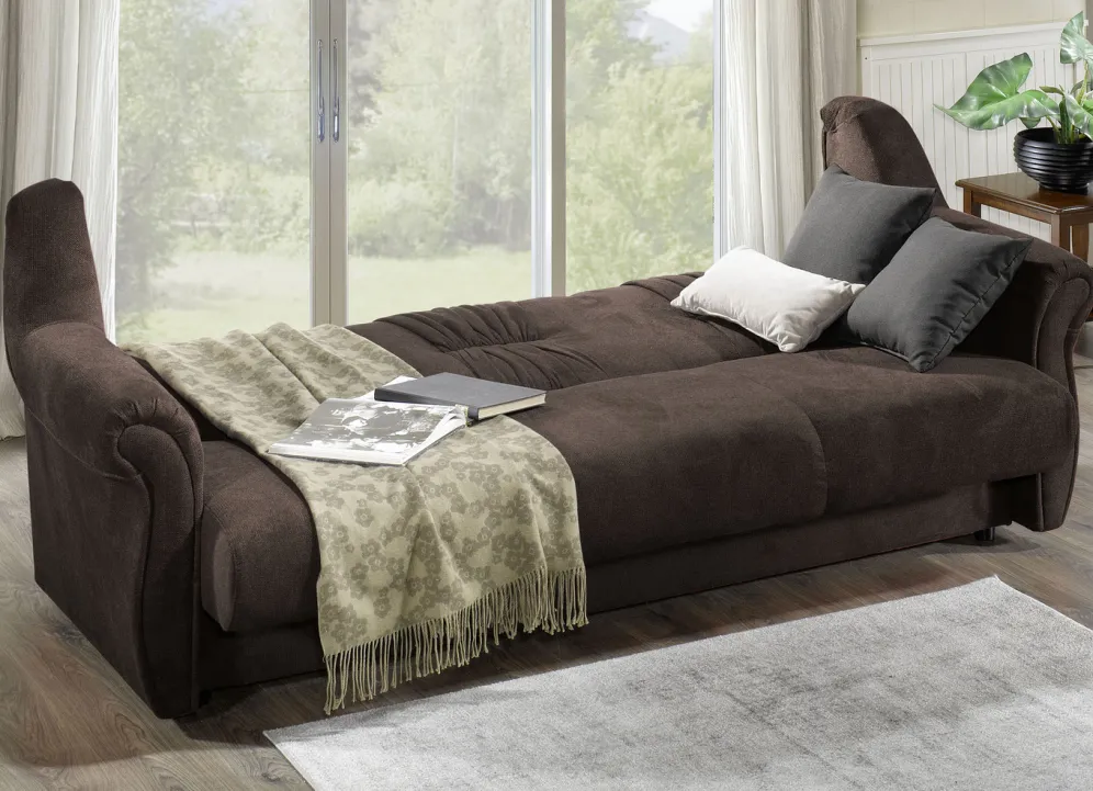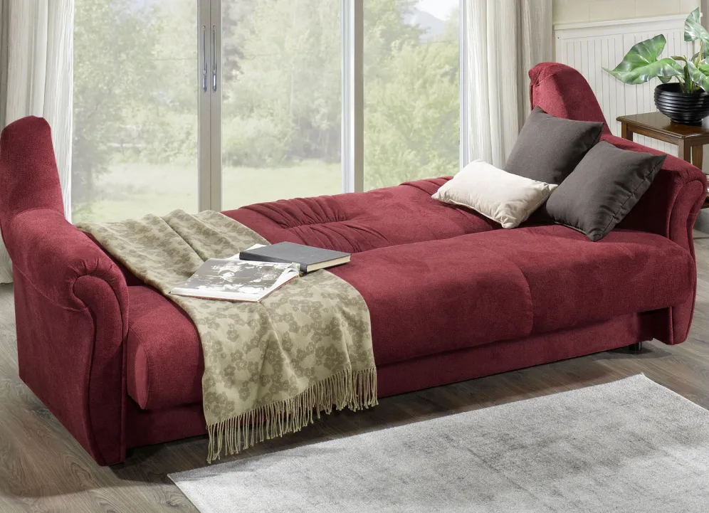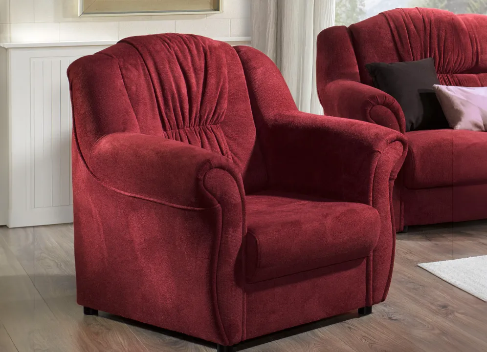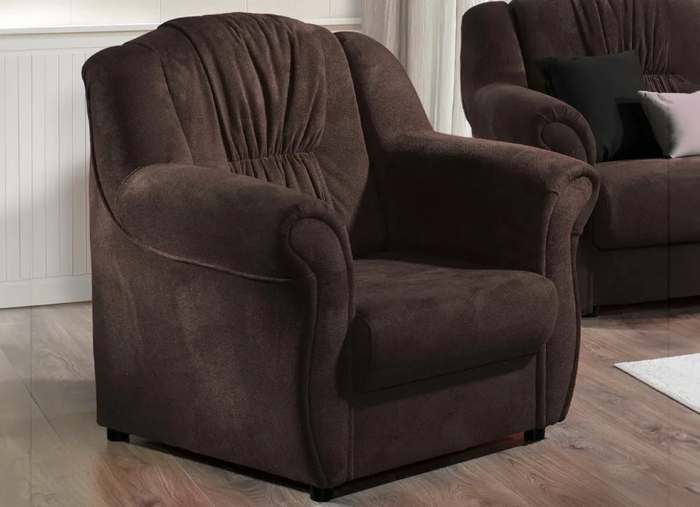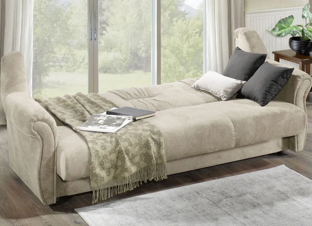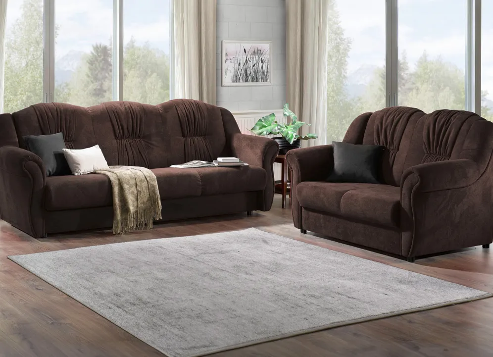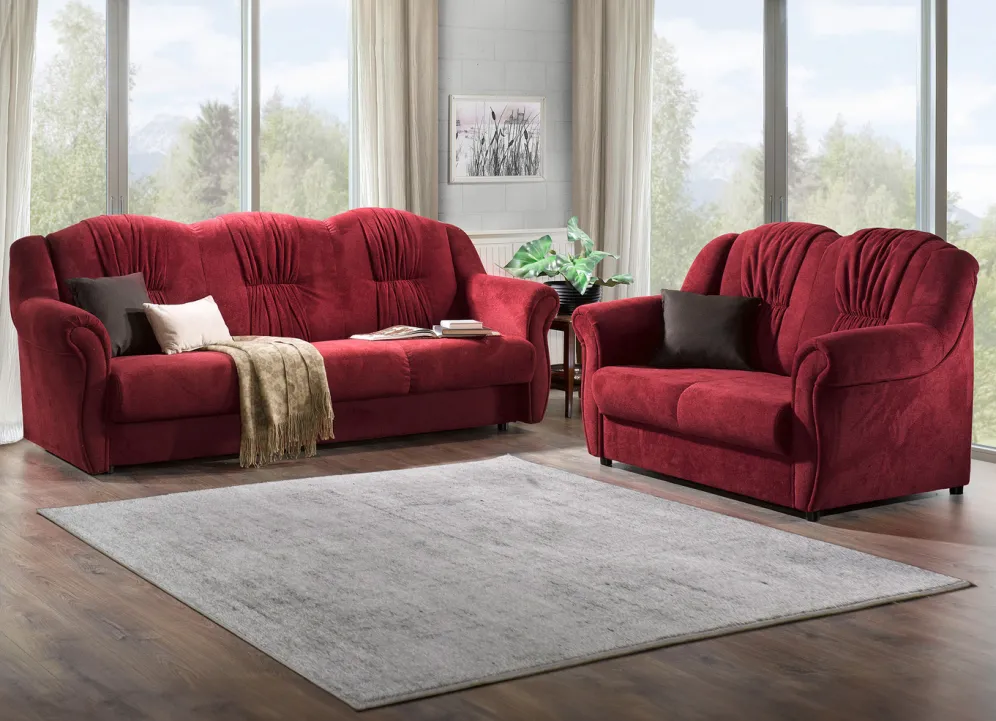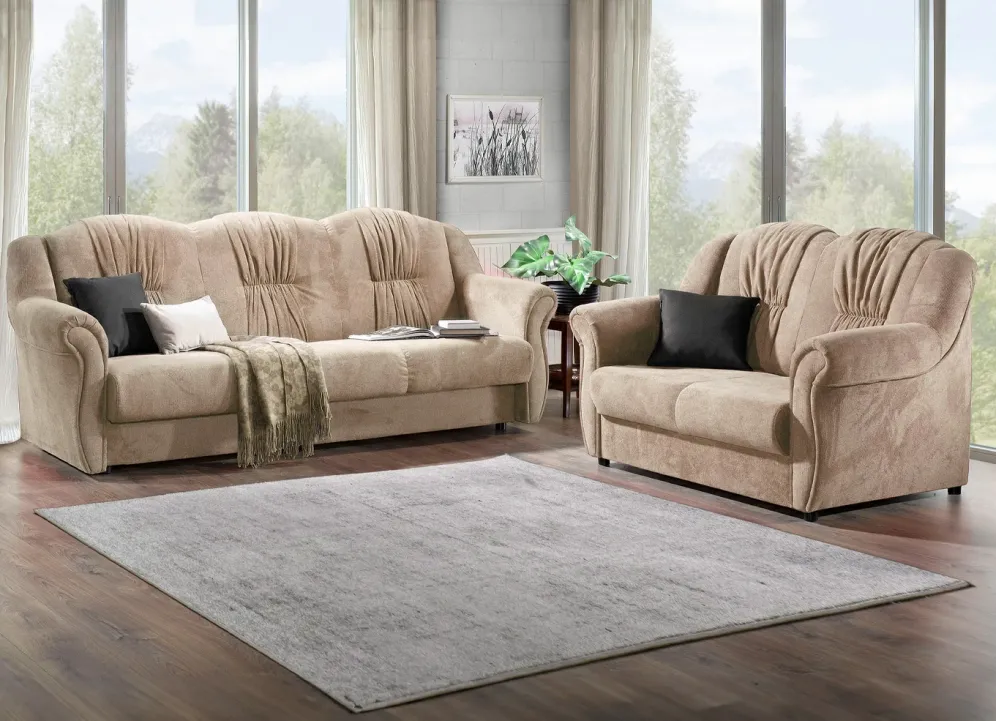 Polstermöbel auf stabilem Holzgrundgestell mit Bettkasten, hochwertigem Federkern (nur im Dreisitzer, im Zweisitzer und Sessel jeweils mit Nossag-Unterfederung) sowie Schaumstoff und Polstervlies gearbeitet. Bezugsstoff aus 90% Polyester und 10% Nylon. Der Dreisitzer mit Bettfunktion ist im Nu in ein Gästebett verwandelt. Auf schwarzen Kunststofffüßen. Einfache Endmontage. Lieferung ohne Dekokissen.
