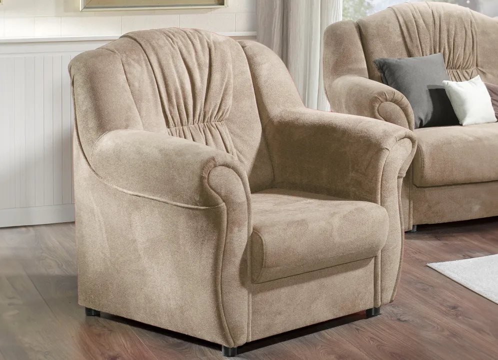 Frei im Raum aufstellbare Polstermöbel mit Federkern in der Ausführung Sessel und in Beige.