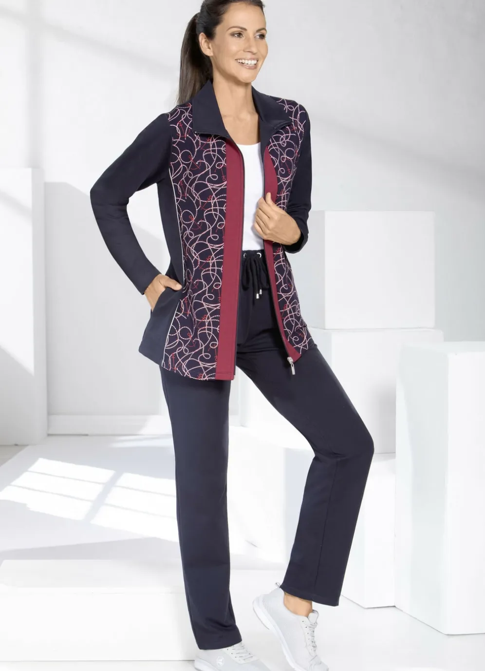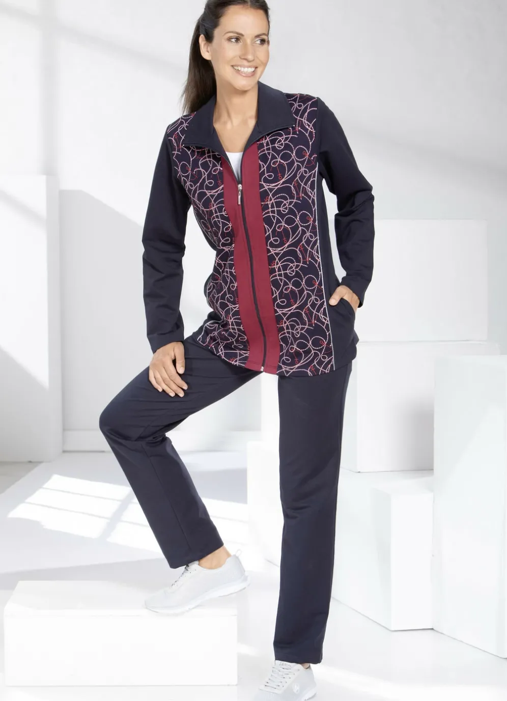 Exklusiver Freizeitanzug in Marine-Bordeaux. Gerade geschnittenes Oberteil mit Seitentaschen, Zierpaspel sowie Druck im Vorderteil. Hose mit Kordelzug im Dehnbund und Seitentaschen.