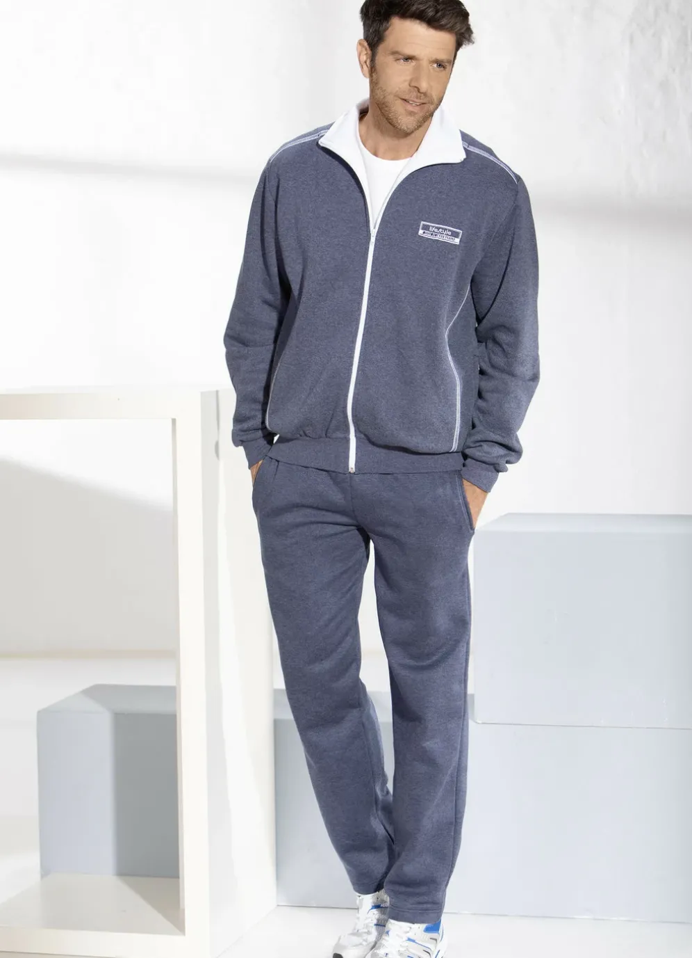 Jeansblau melierter Freizeitanzug. Oberteil mit Stickerei im Vorderteil links, Seitentaschen, elastischen Strickabschlüssen an den Ärmeln und am Saum. Hose: Kordelzug im Dehnbund, Seitentaschen, gerade Beinabschlüsse.