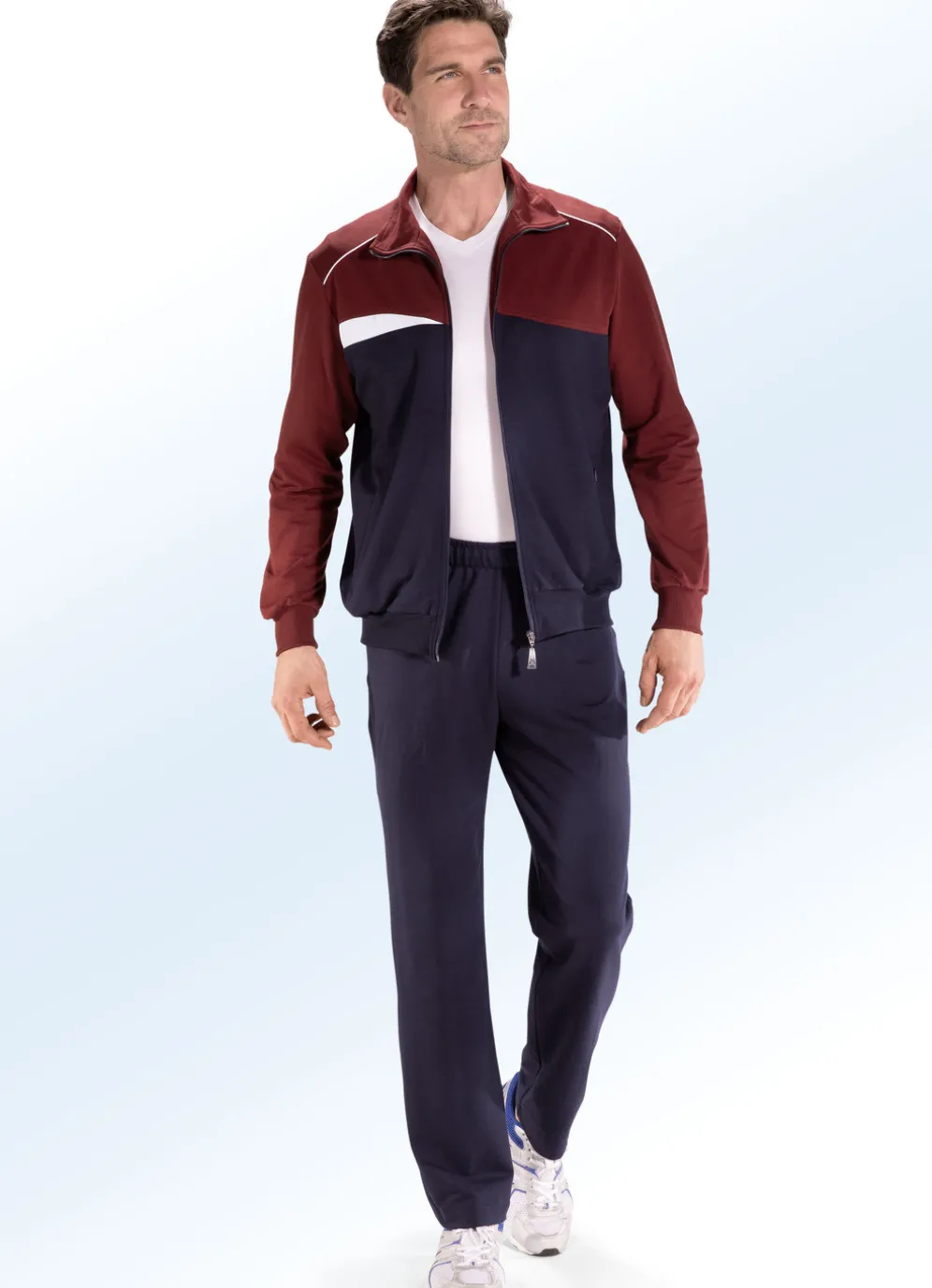 Sportlicher „Athlet“-Freizeitanzug in Marine-Bordeaux: durchgehendem Reißverschluss, Zierpaspel und Kontrasteinsatz im Vorderteil, zwei Reißverschluss-Taschen, elastischen Abschlüsse an den Ärmeln und am Saum. Hose mit Kordelzug im Dehnbund, Seitentaschen sowie geraden Beinabschlüssen.
