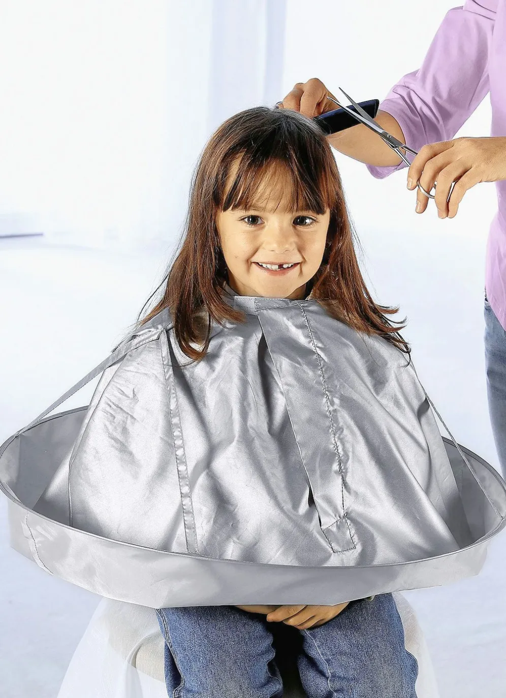 Einfach den Frisuren-Schirm am Hals mit Klettverschluss schließen und schon fallen die Haare nach dem Schneiden in den stabilisierten Auffangring. Nach Benutzung platzsparend zusammenfaltbar. Aus 100% Polyester. Maße: ca. ø 60 cm.