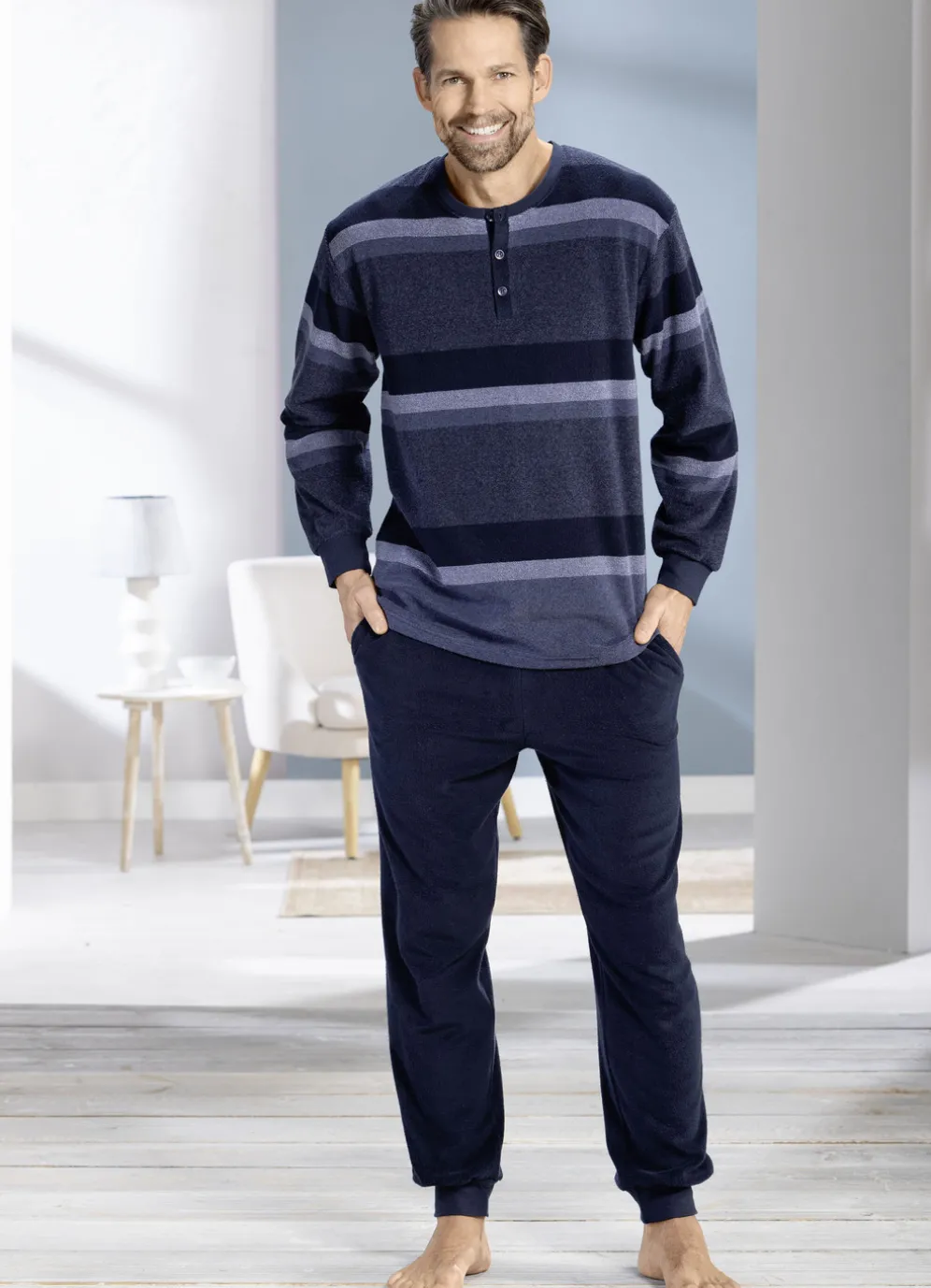 Gemütlicher Schlafanzug in Jeansblau-Marine! Oberteil mit garngefärbtem Ringeldessin, Knopfleiste,
