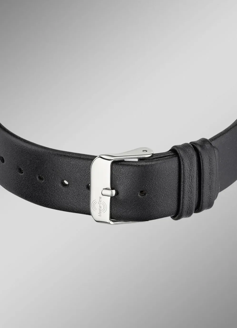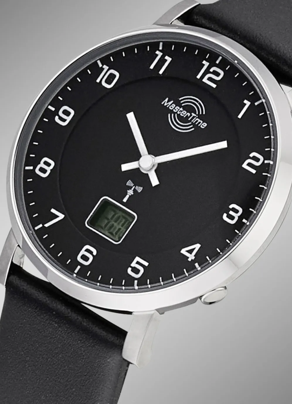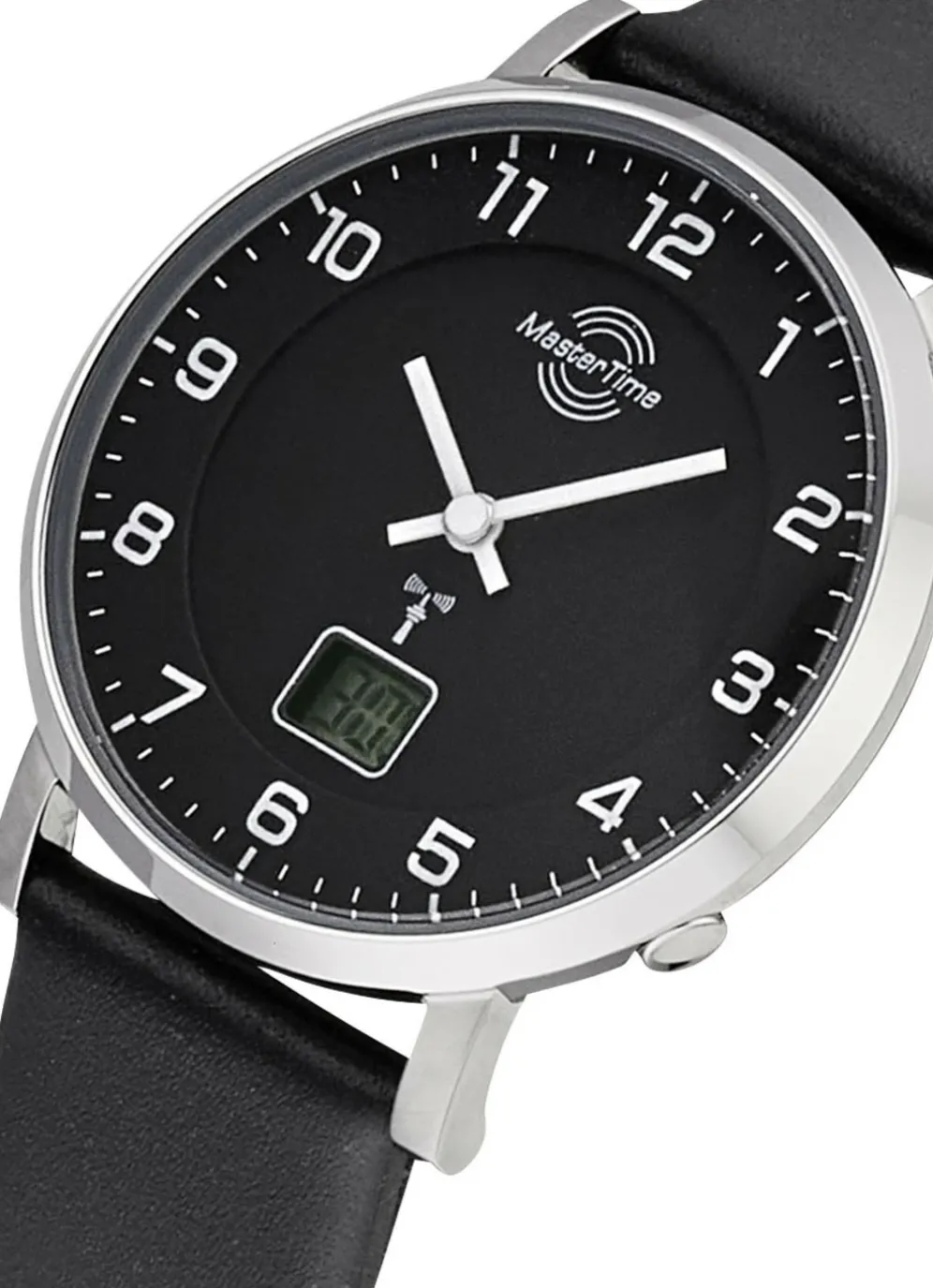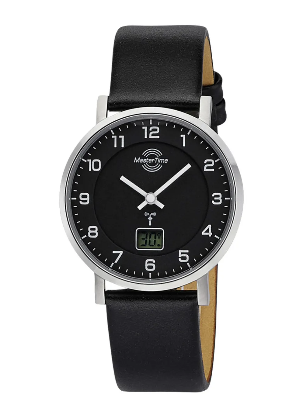 Modische, sportliche flache Damen-Lederarmbanduhr mit schwarzem Zifferblatt. Funkgesteuert, mit Sekunden- Datums- und Tagesanzeige im Digitalfeld. Automatische Umstellung von Sommer- und Winterzeit. Das Armband ist schwarz und aus Leder gefertigt . Die Uhr ist bis zu 5 Bar wasserdicht und hat einen Gehäusedurchmesser von 36 mm.
