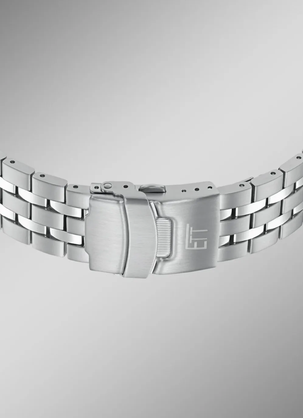 Zu den besonderen Funktionen des Chronographen zählen eine analoge Datumsanzeige, eine kleine 24-Stunden-Anzeige, eine kleine Minutenanzeige und eine Multi-Anzeige (kleine Sekunde, Wochentag, Ladezustand, Signalempfang und Stoppuhr). Ausgestattet ist die Funkuhr mit einem grünen Zifferblatt. Das Edelstahlgehäuse ist bis 10 bar wasserdicht..