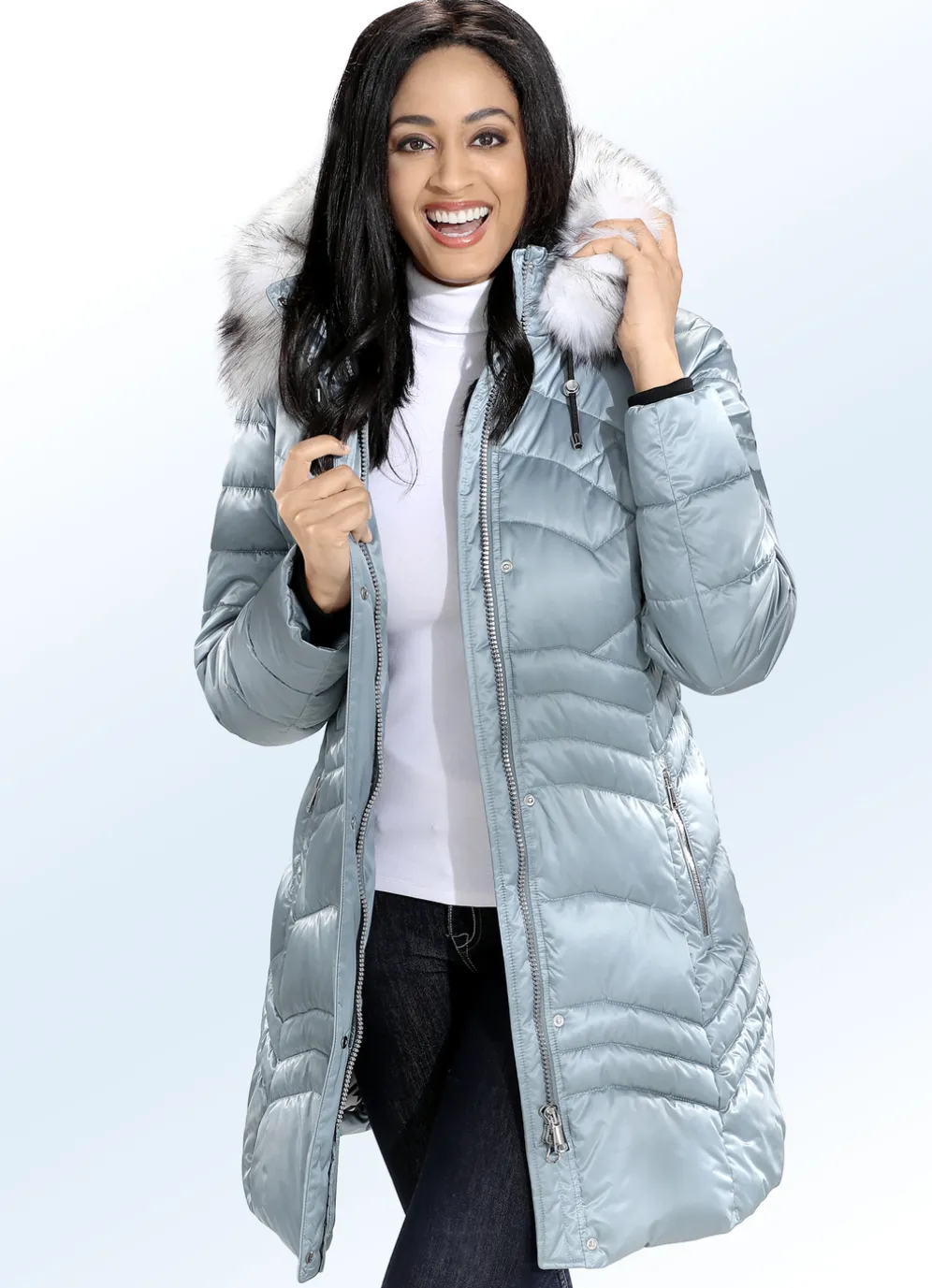 Mit modischem Chic zeigt sich dieser traumhafte Funktions-Kurzmantel: abnehmbare Kapuze mit Durchzugsband, Stopper und abnehmbarem Kunstpelz-Besatz, durch 2-Wege-Reißverschluss unter der Druckerleiste hoch schließbarer Stehkragen, Reißverschlusstaschen sowie eine Innentasche. Länge ca. 88 cm.