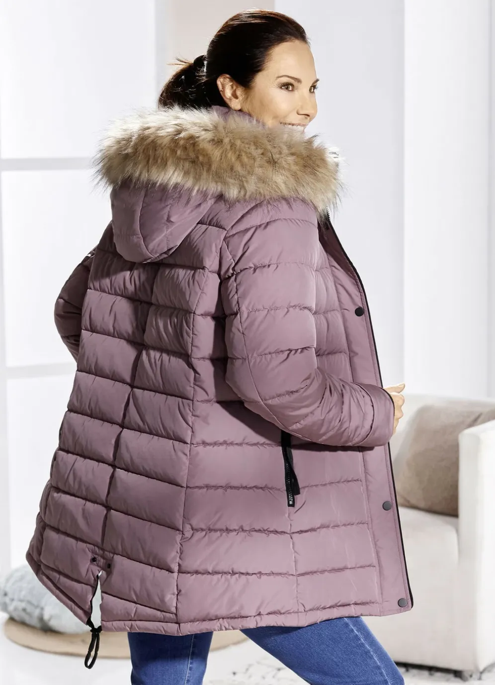 Aparte, malvefarbene Funktions-Longjacke: abnehmbare Kapuze mit Durchzugsband, Stopper und abnehmbarem Kunstpelz-Besatz, durch 2-Wege-Reißverschluss unter der Druckerleiste hoch schließbarer Stehkragen, Reißverschlusstaschen, Umschlagärmel mit Windfang aus Rippenstrick, eine Innentasche sowie leicht verlängertes, abgerundetes Rückteil mit Schlitz und Durchzugsband. Länge ca. 85 cm, ab Gr. 40 ca. 86 cm, ab Gr. 44 ca. 87 cm, ab Gr. 48 ca. 88 cm, bei Gr. 52 ca. 89 cm.