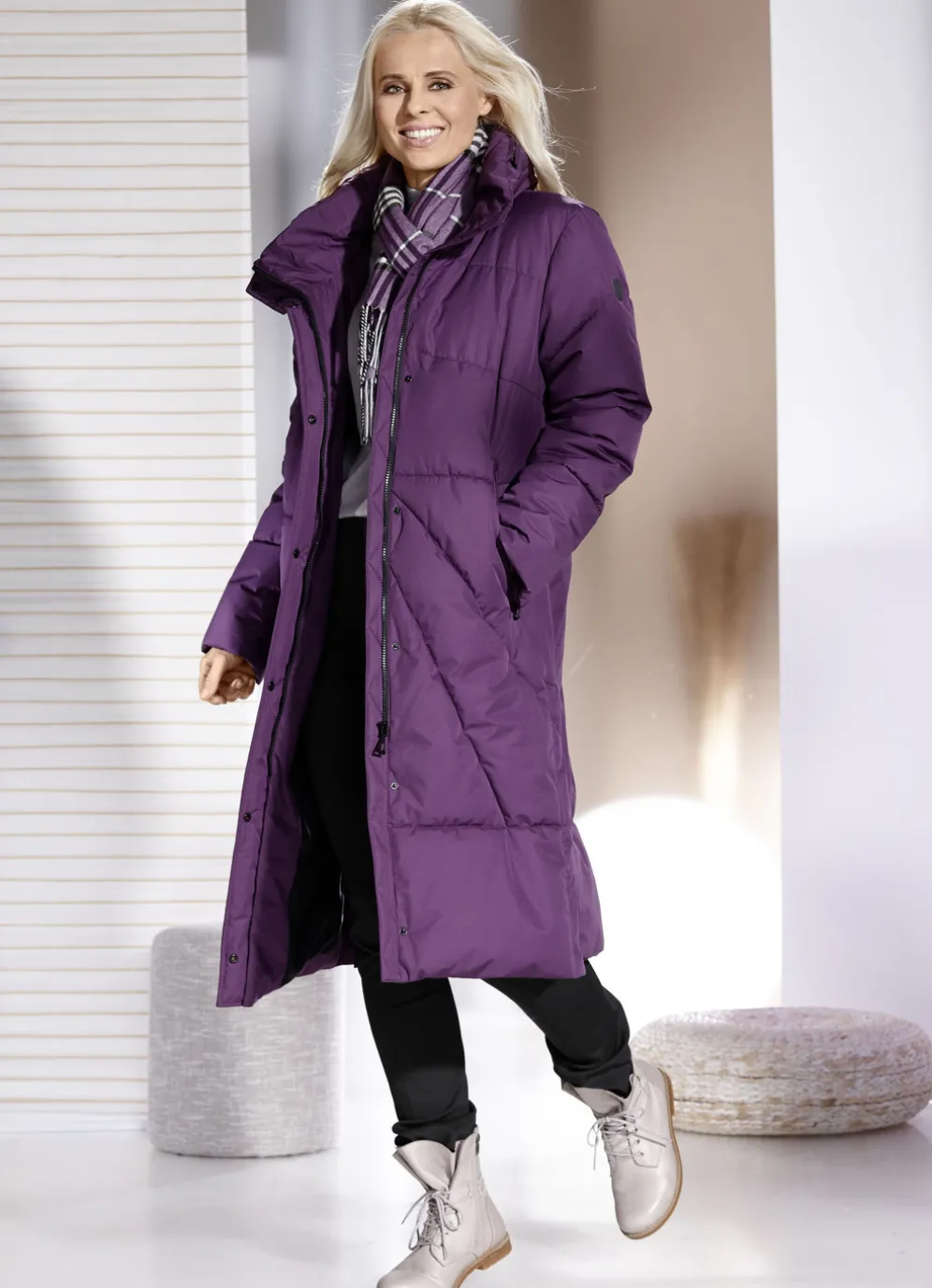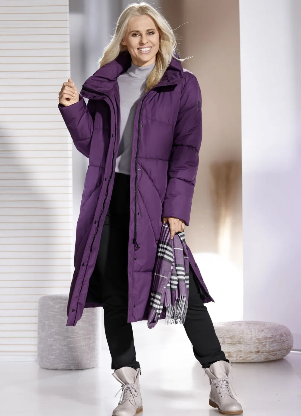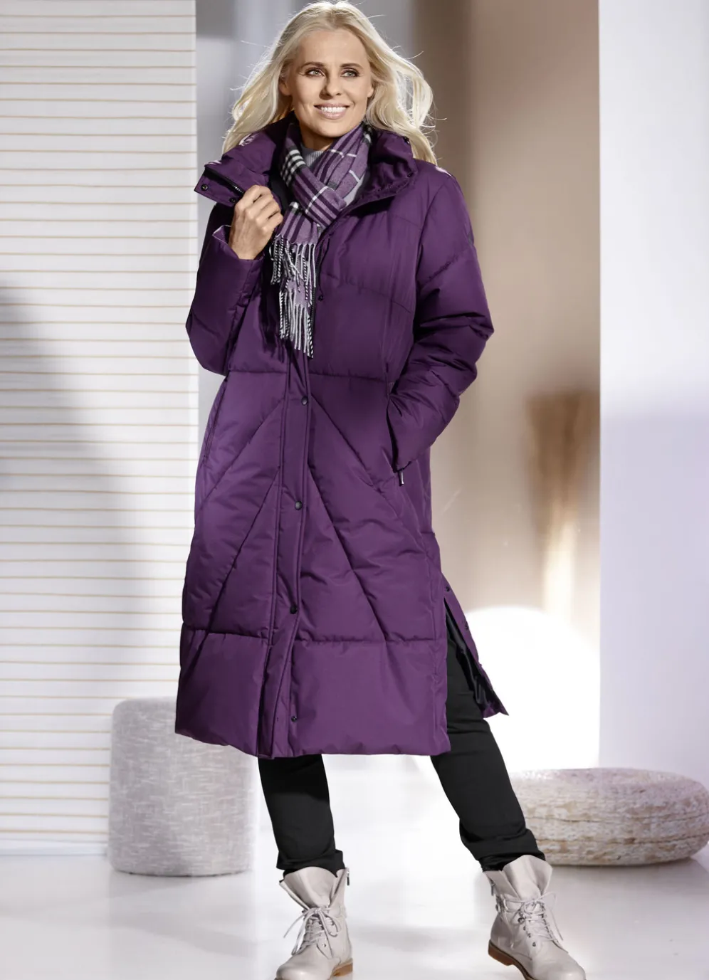 Geschmackvoller Funktionsmantel: im Kragen verstaubare, feste Kapuze mit Durchzugsband und Stopper, durch Reißverschluss unter der Druckerleiste hoch schließbarer Stehkragen, Paspeltaschen mit Reißverschluss, Seitenschlitze mit Druckern sowie eine Innentasche. Länge ca. 104 cm.