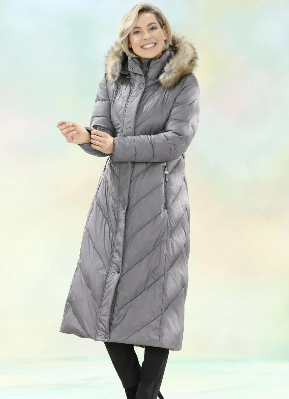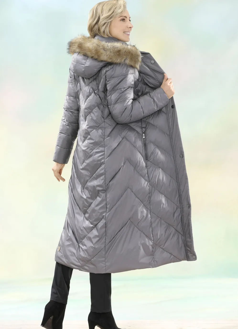 Attraktiver, schieferfarbener Funktionsmantel: abnehmbare Kapuze mit Durchzugsband, Stopper und abnehmbarem Kunstpelz-Besatz, durch 2-Wege-Reißverschluss unter der Druckerleiste hoch schließbarer, gesmokter Stehkragen, Windfangärmel aus Rippenstrick sowie eine Innentasche. Länge ca. 120 cm.