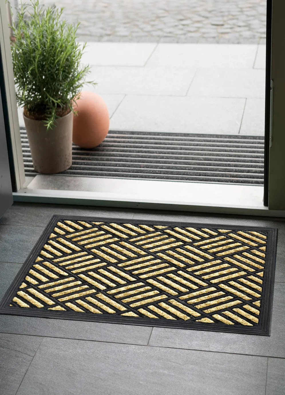 Fußmatte mit rutschhemmender Rückseite in Natur-Schwarz.