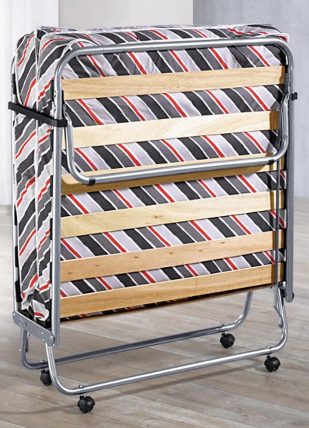 Gästebett mit Lattenrost, 10-cm-Kaltschaummatratze und silberfarbenem Stahlrohrgestell auf 4 praktischen Rollen. Mit Automatik (Standbeine klappen automatisch mit auf). Liegehöhe 41 cm