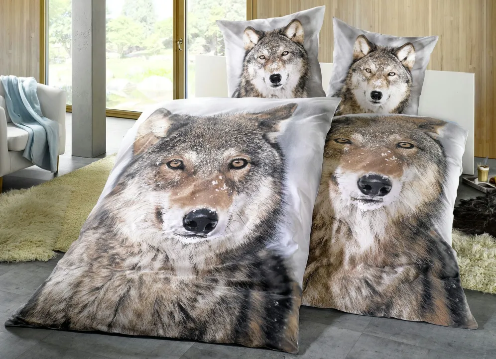 Diese besondere Bettwäsche-Garnitur begeistert mit ihrem eindrucksvollen Druckmotiv, das einen Wolf in seiner ganzen Pracht zeigt. Mit praktischem Reißverschluss gearbeitet. Die hochwertige Qualität: Renforcé aus 100% Baumwolle. Waschbar bis 40 °C.