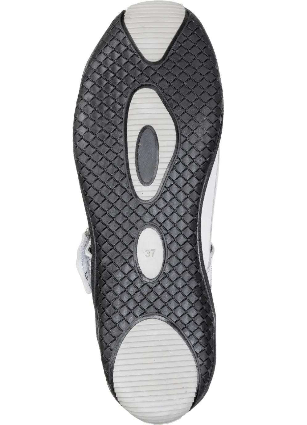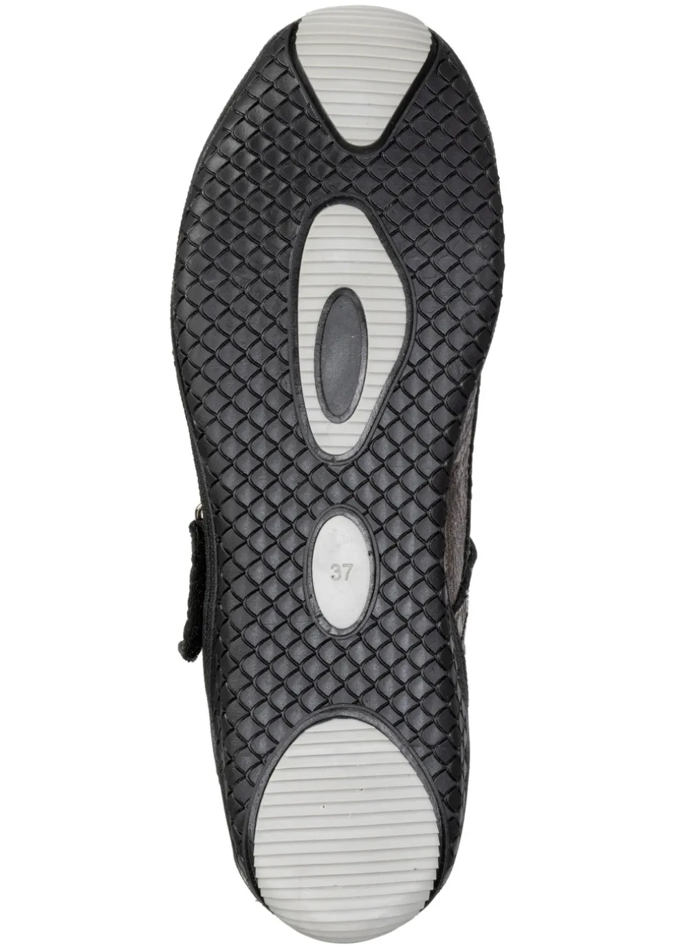 Modische Slipper aus teilweise glänzendem Nappaleder mit dezenter Knitter-Struktur: Weite G, verstellbare Klettspange, herausnehmbares Lederfußbett, superleichte TR-Laufsohle sowie 10 mm Keilabsatz