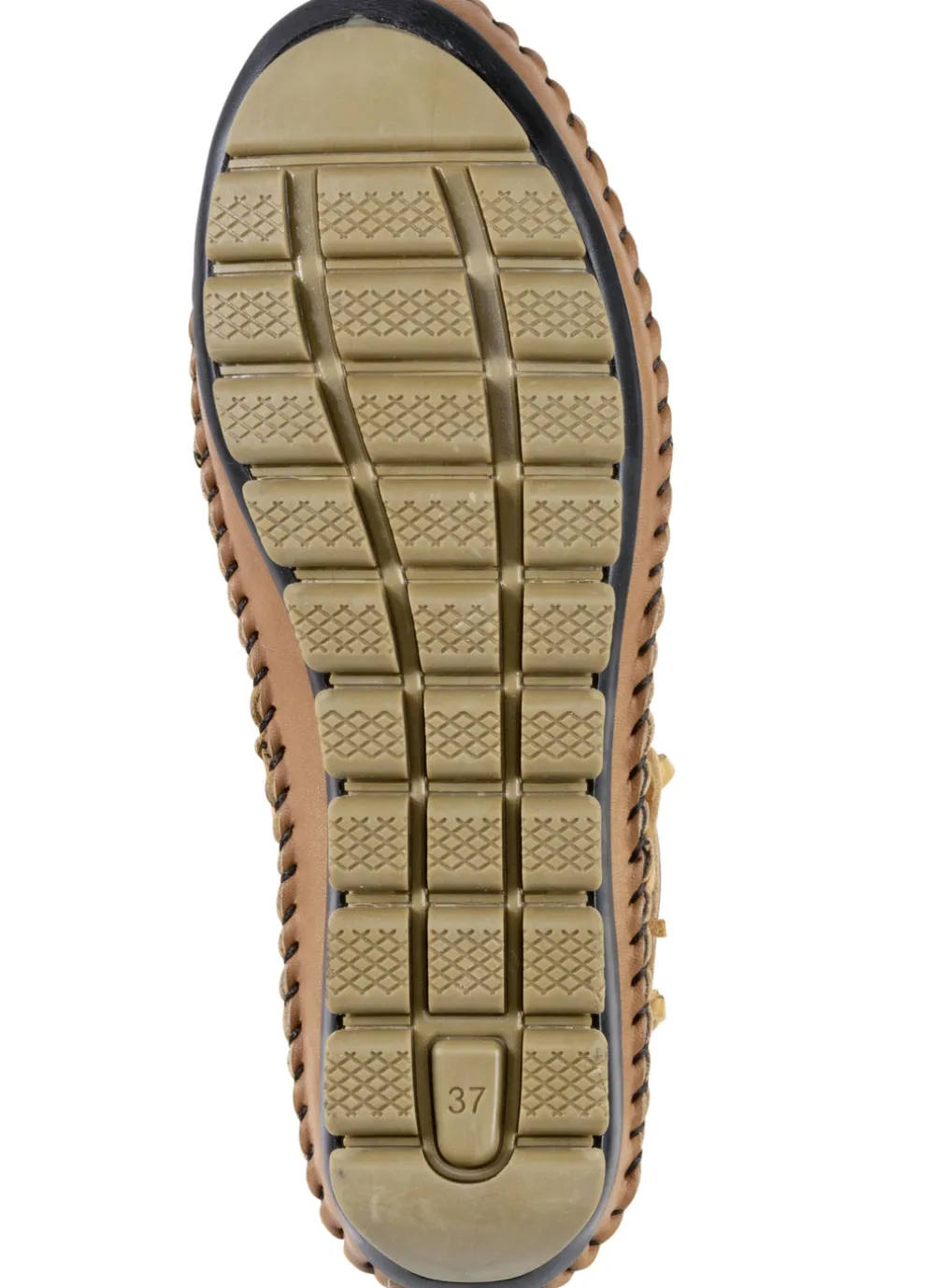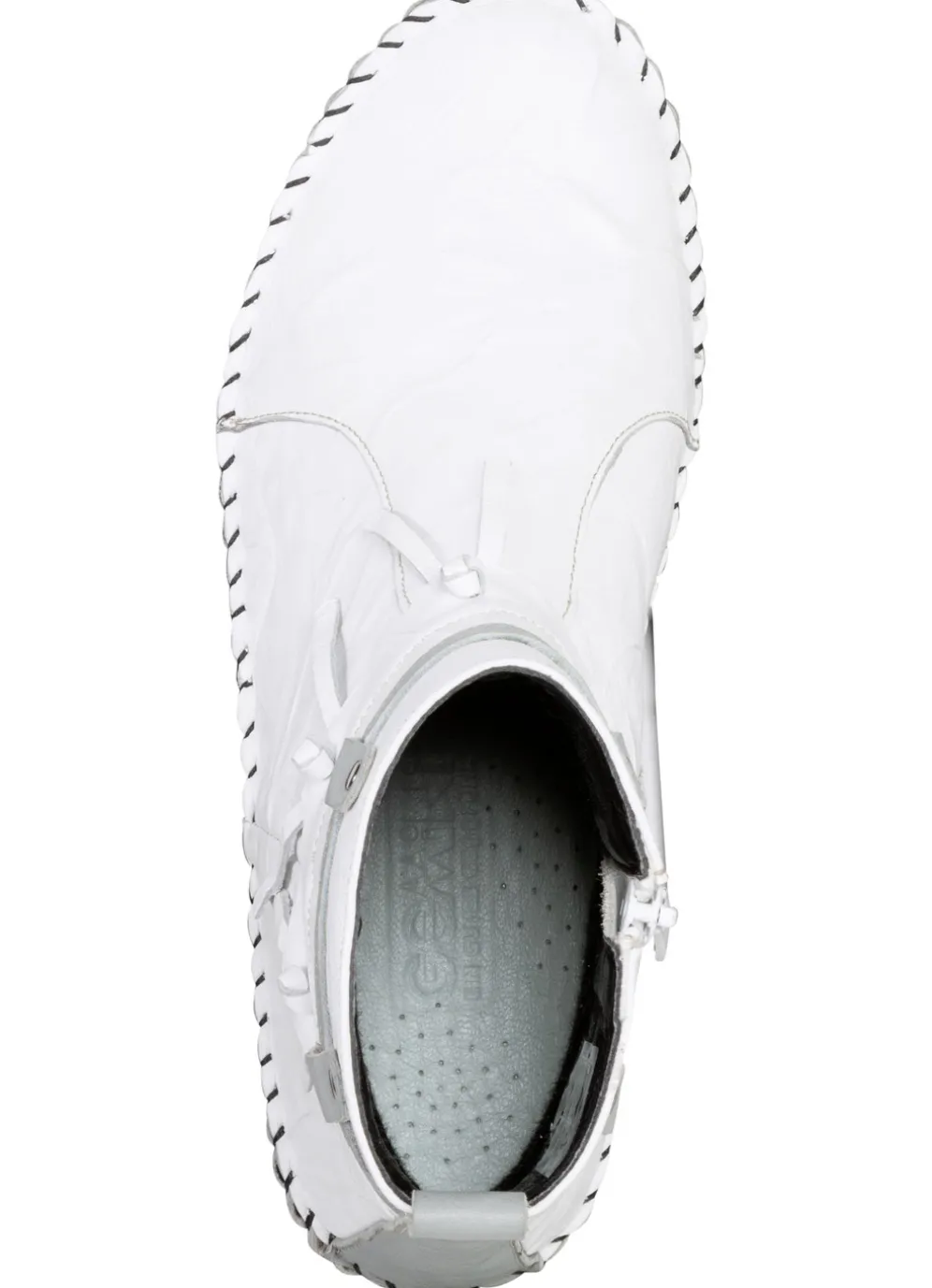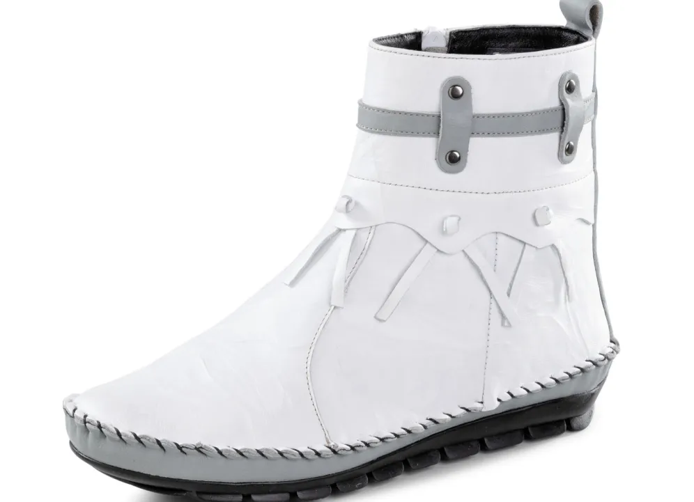 Mokassin-Stiefelette aus Rind-Nappaleder mit Knitter-Struktur: pfiffige Leder-Verzierungen, Weite G, Innenreißverschluss, Textilfutter, herausnehmbares Lederfußbett, leichte TR-Profilsohle sowie 15 mm Keilabsatz. Schafthöhe ca. 15 cm