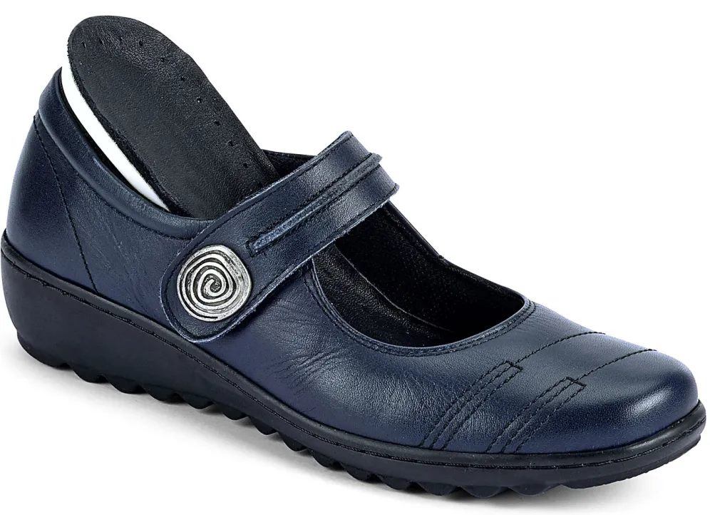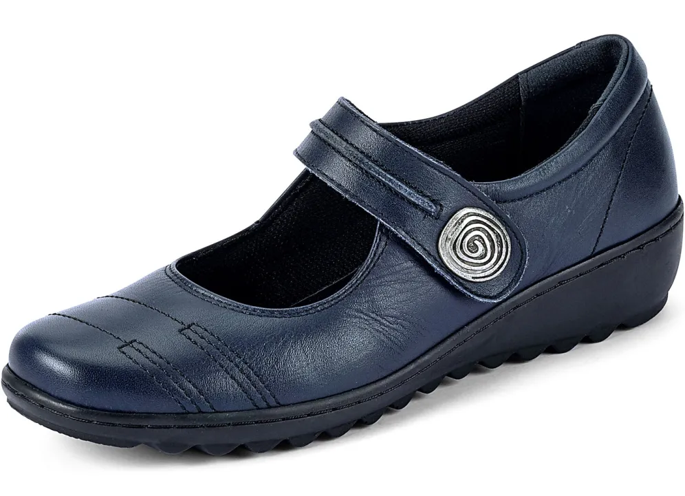 Slipper aus Rind-Nappaleder: Weite G, angenehme Polsterung, verstellbare Klettspange mit Gummizug, Textilfutter, herausnehmbares Lederfußbett, superleichte PU-Profilsohle sowie 30 mm Keilabsatz