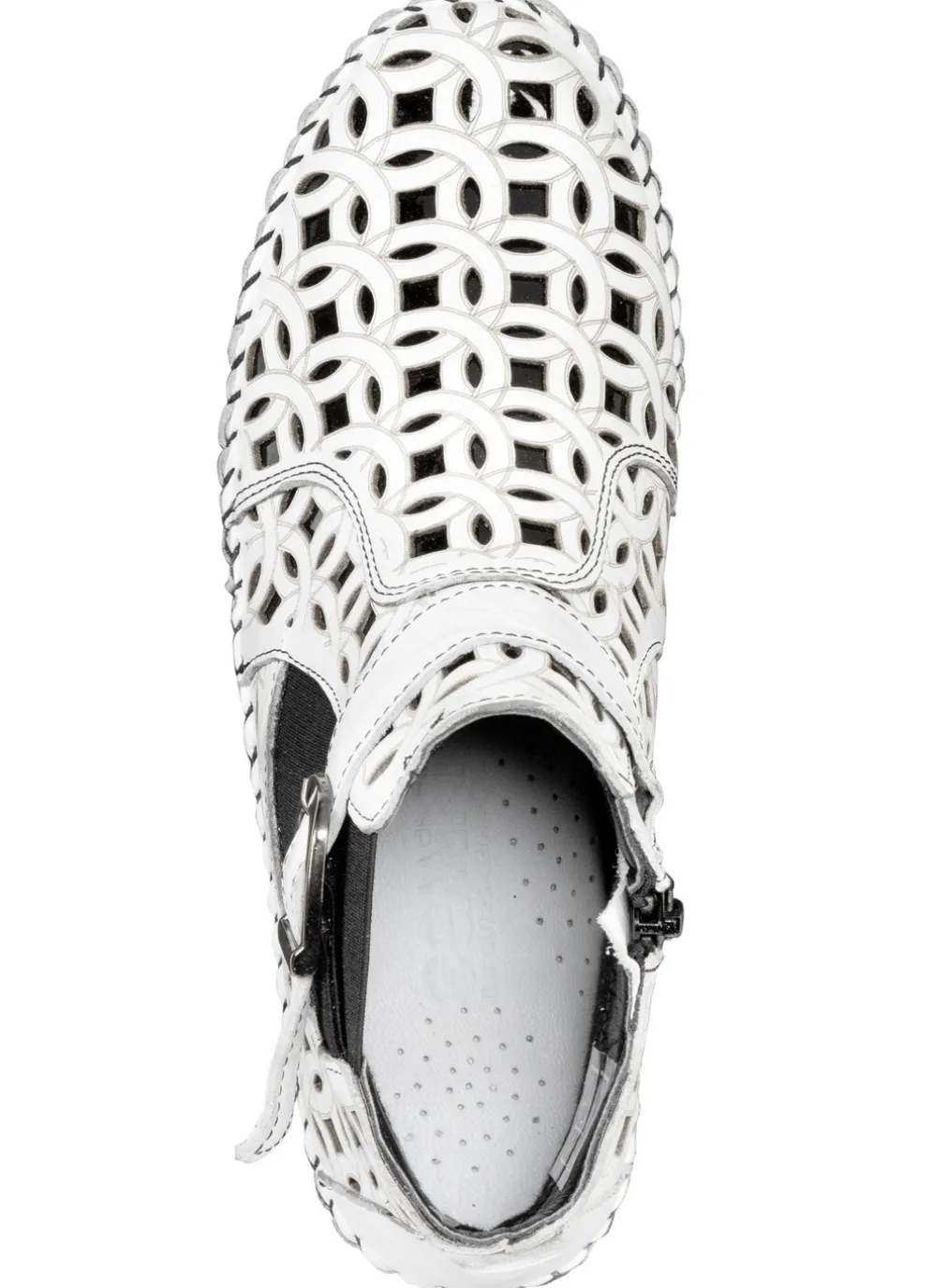 Boots in Mokassin-Machart, aus fantasievoll gelochtem Nappaleder, mit glänzendem Lackleder in Kontrastfarbe unterlegt: Weite G, seitlicher Elastikeinsatz, verstellbare Spange mit Gummizug, Innenreißverschluss, Textilfutter, herausnehmbares Lederfußbett, leichte TR-Profilsohle, 15 mm Keil. Schafthöhe ca. 10 cm