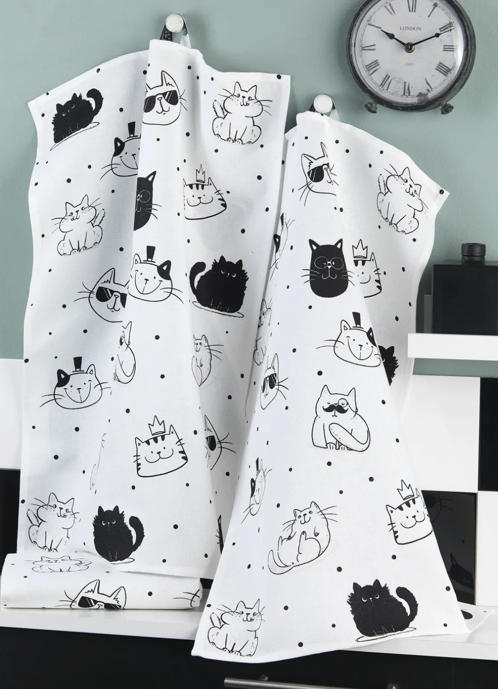 Ein witziger Hingucker sind diese praktischen Geschirrtücher mit niedlichen schwarz-weißen Katzen-Motiven. Die strapazierfähige und saugstarke Qualität: Halbleinen aus 50% Baumwolle und 50% Leinen. Waschbar bis 60 °C. Maße: je 50/70 cm