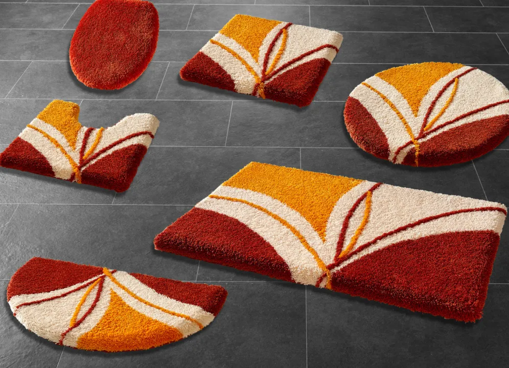| Size | 100 (Vorleger halbrund, 50/ 80 cm), 101 (Teppich, 50/ 90 cm), 102 (Teppich, 60/100 cm), 103 (Teppich, 70/120 cm), 106 (Teppich rund, ø 80 cm), 109 (Hänge-WC-Vorleger, 50/ 50 cm), 112 (WC-Deckelbezug, 47/ 50 cm) |