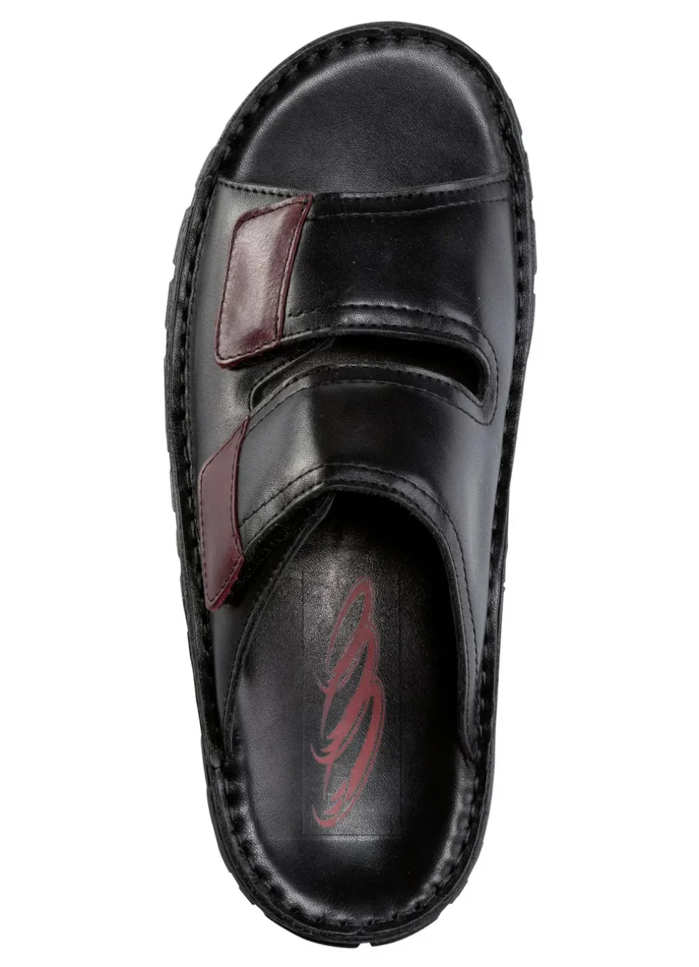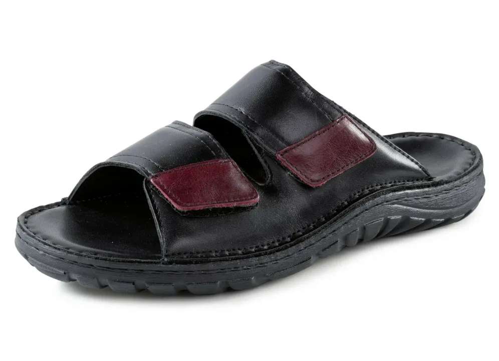 Pantoletten von GINO GALANTE in Schwarz-Chianti, aus gepolstertem Rind-Nappaleder: zwei Klettspangen, Lederfutter, gepolsterte Lederdecksohle, leichte PU-Profilsohle