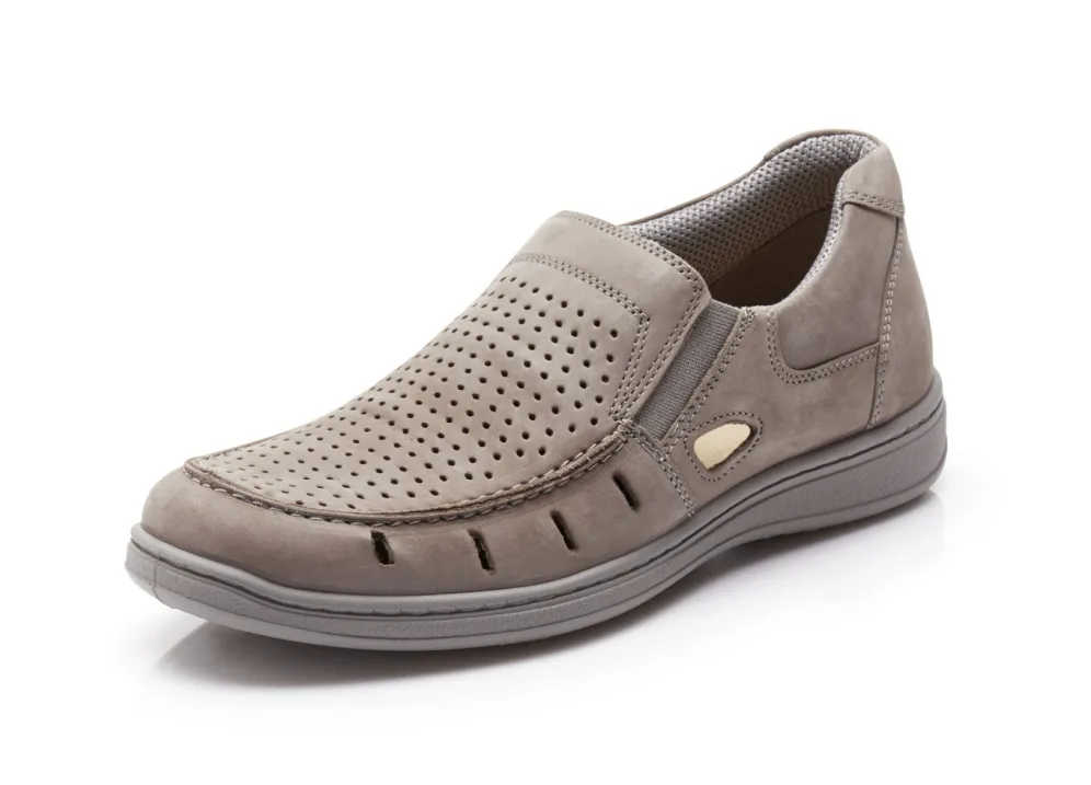 Slipper von GINO GALANTE aus Rind-Nubukleder mit luftiger Perforation: seitlich eingesetzte Gummizüge, Textilfutter, herausnehmbares, atmungsaktives Fußbett sowie leichte PUR-Luftpolster-Profilsohle