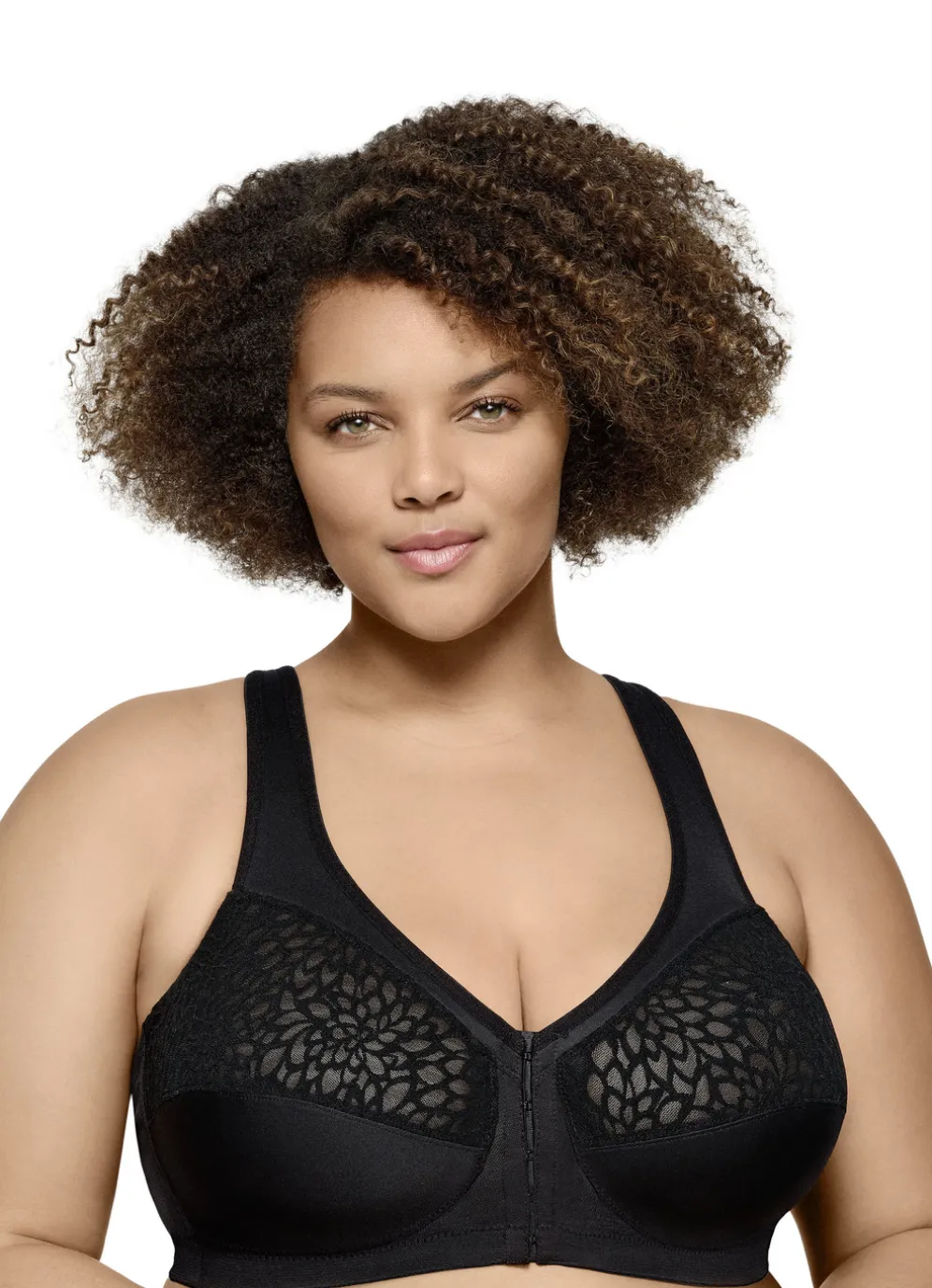 Schwarzer „Glamorise“-Stütz-BH mit unterlegter Elastikspitze in den Obercups, gepolsterten „MagicLift®“-Bändern, praktischem Vorderverschluss, weich gepolsterten, verstellbaren Stretchträgern.