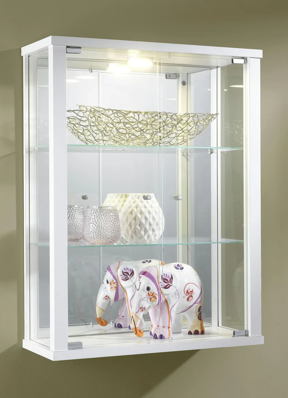 Geschmackvolle und moderne Hängevitrine mit ansprechenden Dekors und robuster Verarbeitung. 2 Glastüren, dahinter je 2 Glas-Einlegeböden. Mit rundem ESG-Sicherheitsglas.