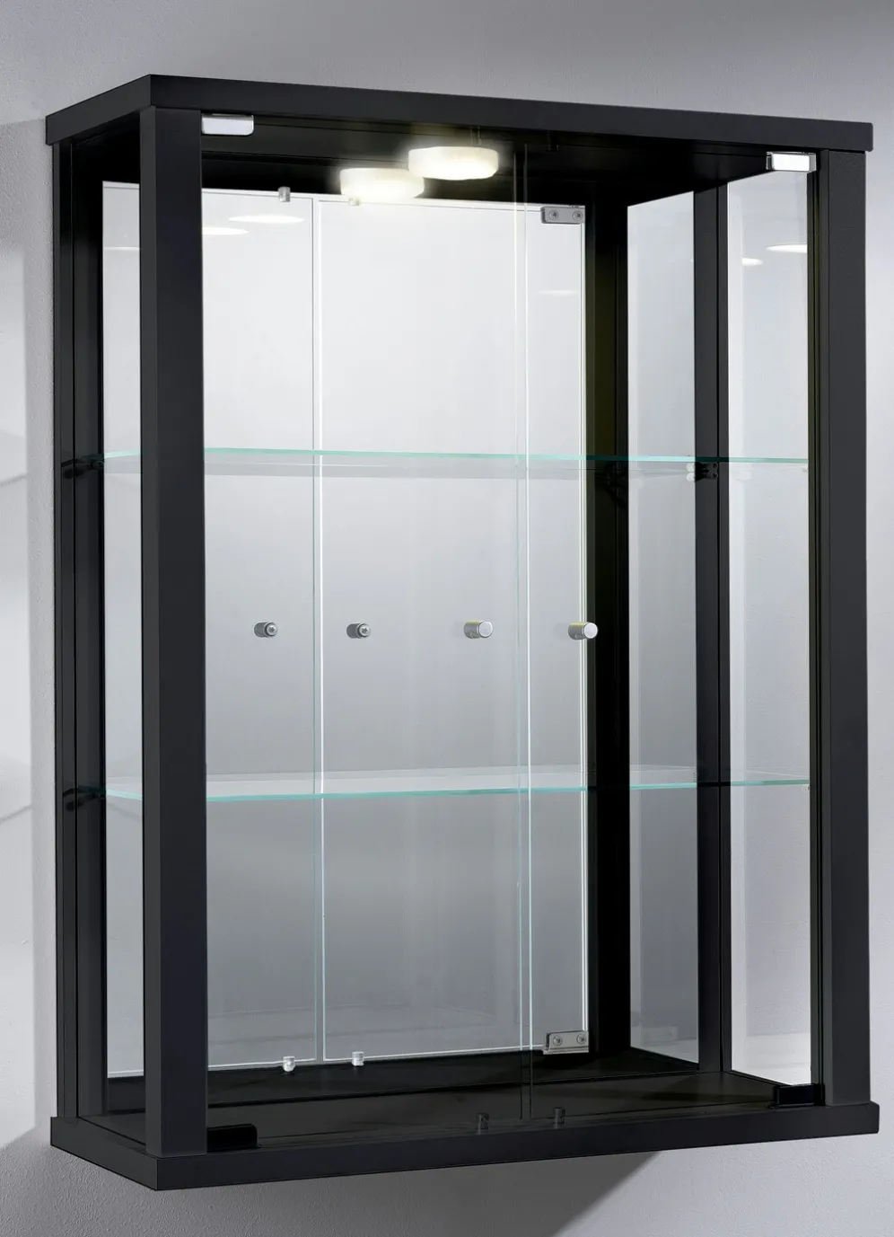 Hängevitrine mit ESG-Sicherheitsglas in der Ausführung ohne LED-Beleuchtung und in Weiss.