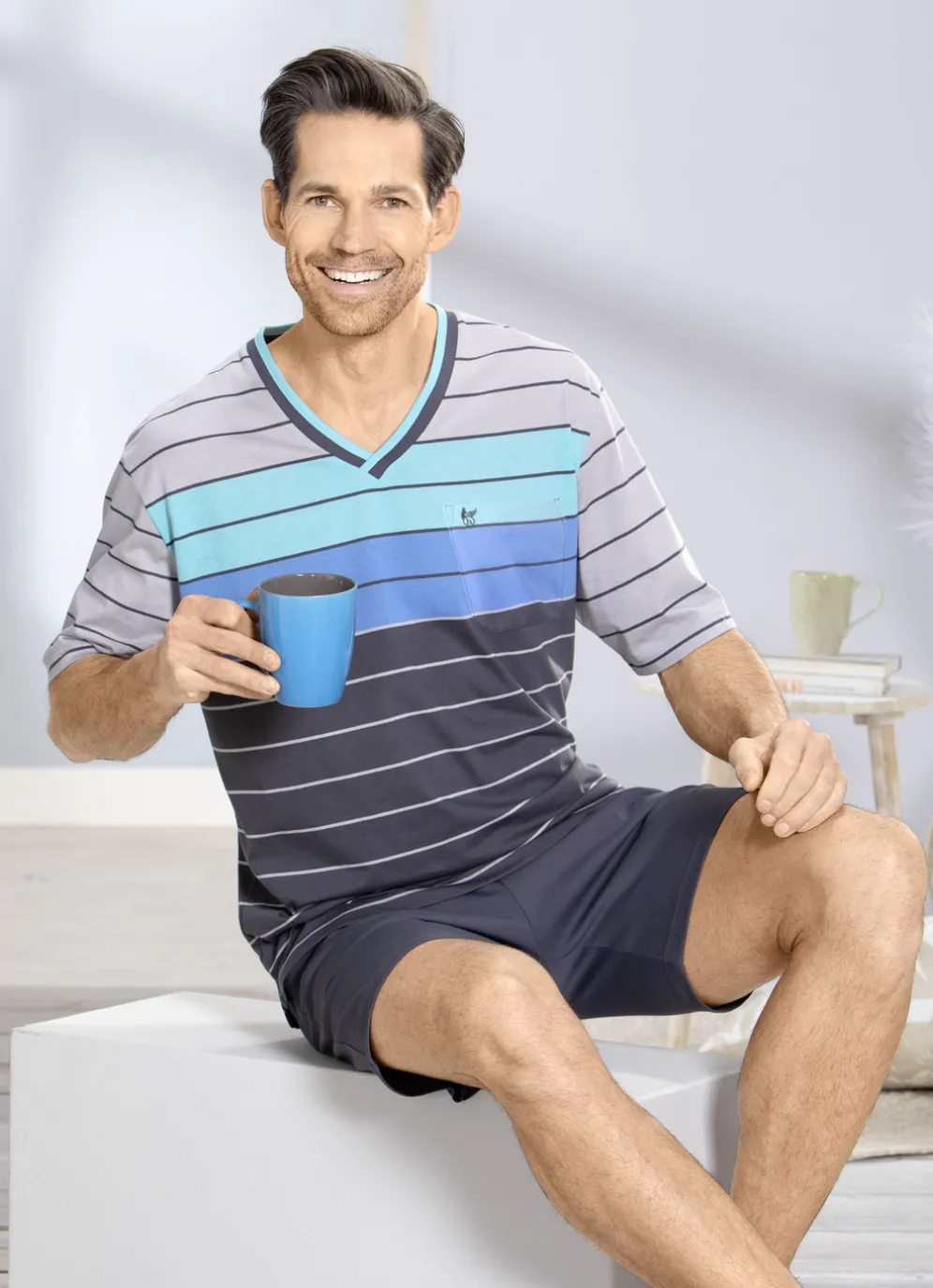„hajo“-Shorty: Oberteil mit garngefärbtem Ringeldessin in Grafit-Grau-Blau, V-Ausschnitt, kleinem Stickereimotiv an der aufgesetzten Brusttasche sowie kleinen Seitenschlitzen. Shorts in Grafit mit Durchzugsband im Dehnbund sowie Seitentaschen.
