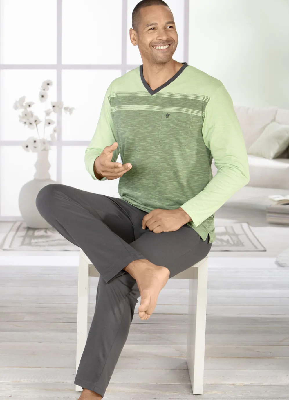 Schlafanzug von „hajo“! Oberteil mit garngefärbtem Ringeldessin in farbharmonischen Grüntönen, V-Ausschnitt, aufgesetzter Brusttasche mit Stickereimotiv sowie kleinen Seitenschlitzen. Grafitfarbene, lange Hose mit Durchzugsband im Dehnbund, Seitentaschen und offenen Beinabschlüssen.