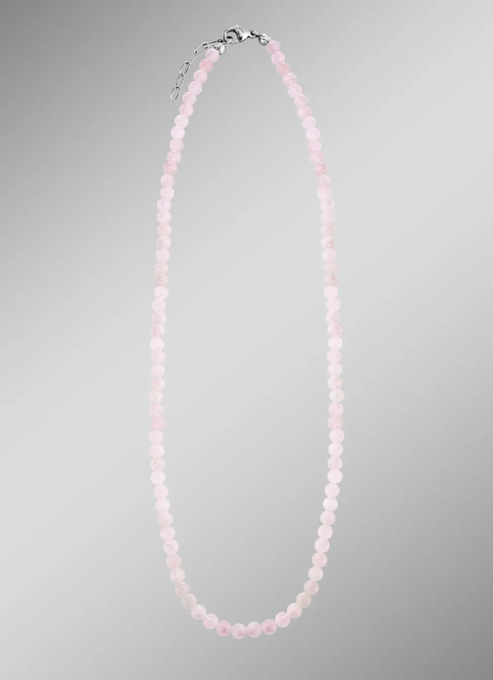 Diese bezaubernde Halskette aus feinstem 925er Silber bringt klassische Eleganz und natürliche Schönheit in Einklang. Die 4,5 mm großen Kugeln aus echtem Rosenquarz, mit einem beeindruckenden Gesamtgewicht von ca. 58,00 ct, strahlen eine sanfte, feminine Ausstrahlung aus. Der praktische Karabinerverschluss und die Länge von 45 cm, ergänzt durch eine 3 cm Verlängerung, sorgen für flexiblen Tragekomfort und eine perfekte Passform.