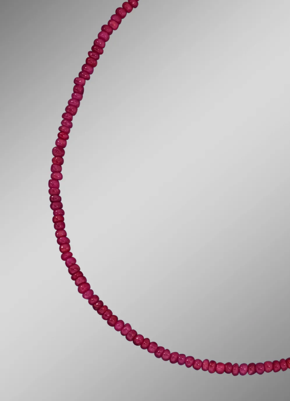 Elegant und sportlich präsentiert sich diese Halskette. Echte rote Rubine zieren die 45 cm langen Kette und erstrahlen in schlichter, matter Eleganz. Die flachen Perlen, quer eingefädelt, sind ca. 3,3 mm stark. Mit einem Karabinerverschluss aus vergoldetem Metall lässt sich das Collier sicher verschließen.