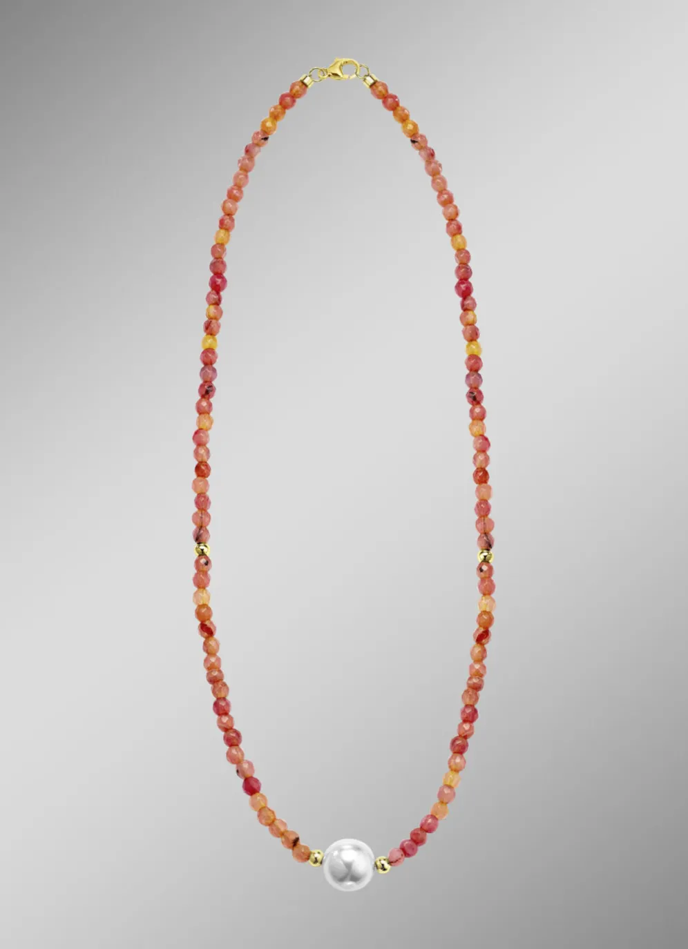 Diese Halskette vereint die Schönheit einer 12 mm großen Muschelkernperle mit facettiertem, gefärbtem Achat von 4 mm Durchmesser und 4 mm großen vergoldeten Kugeln aus Silber 925/- fein. Mit einer Länge von 45 cm und einem praktischen Karabiner aus vergoldetem Silber 925/- fein schmiegt sich diese Kette perfekt um Ihren Hals.