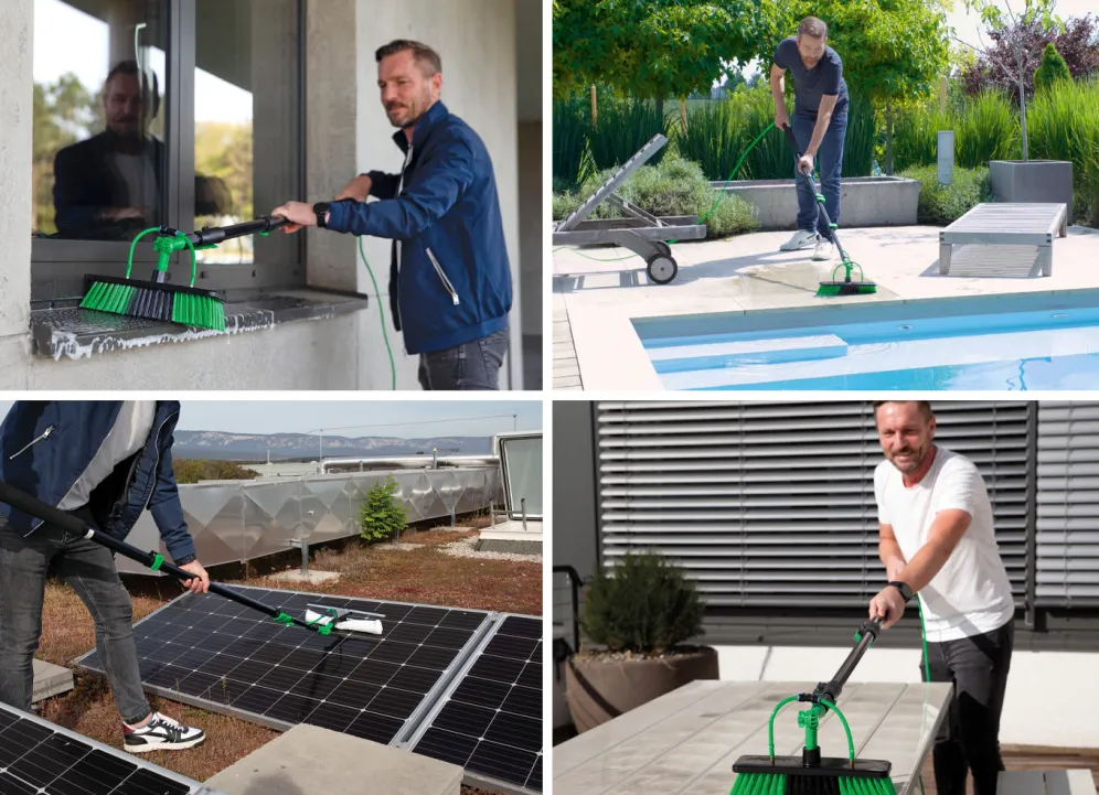 Die ultimative Lösung für eine einfache Reinigung vom Boden bis zum Dach. Der Teleskop-Wasserbesen mit seinem integrierten Wasserdurchlauf-System lässt sich einfach an den Gartenschlauch anschließen. Der 100 ml Reinigungsmittelbehälter mit integriertem Dosier-Regler ermöglicht die Verwendung Ihrer bevorzugten Reinigungsmittel.