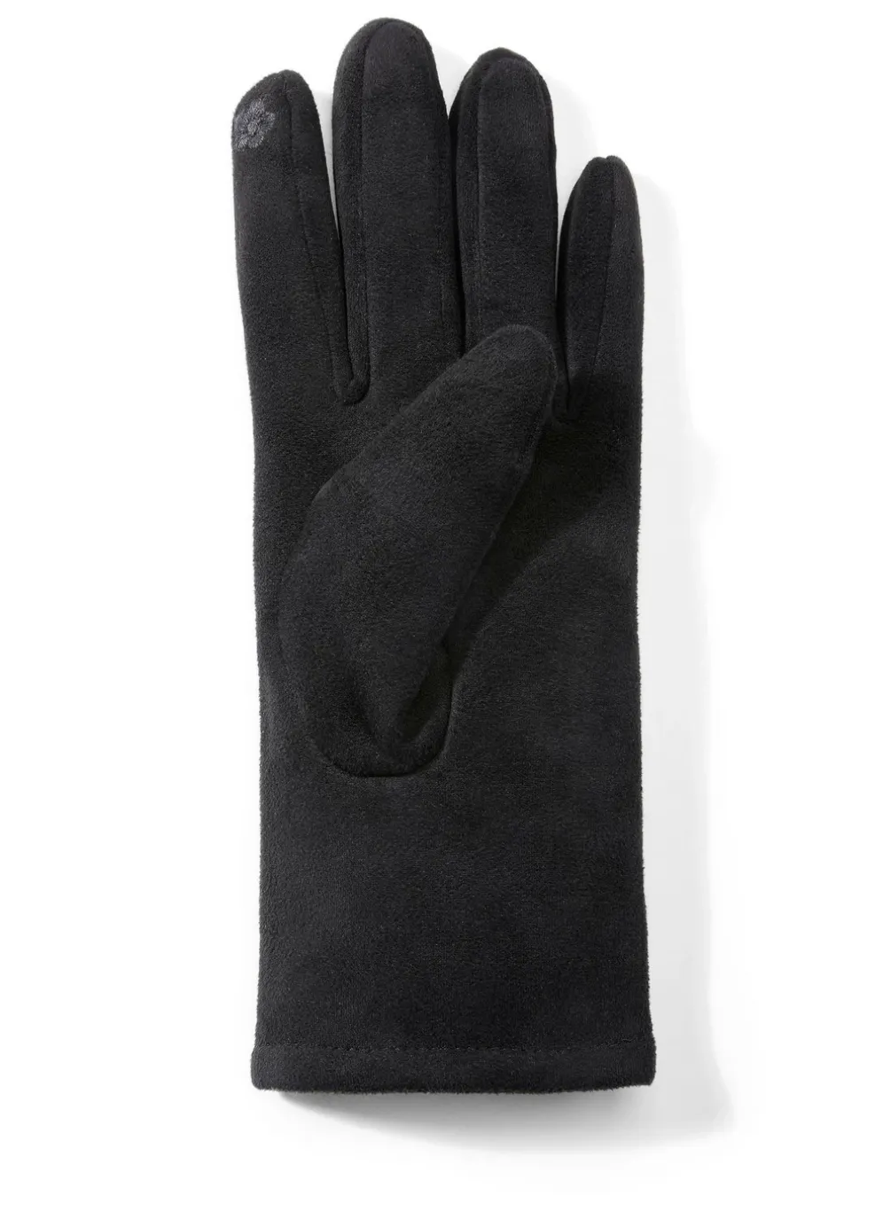 Schwarzer Damen-Handschuh aus weichem Elastikmaterial, mit edel funkelnden, schwarzen Glitzer-Applikationen. Am Zeigefinger touchsceen-fähig! Die Qualität: Veloursmaterial und leichtes Fleece-Futter aus 100% Polyester. In Universalgröße