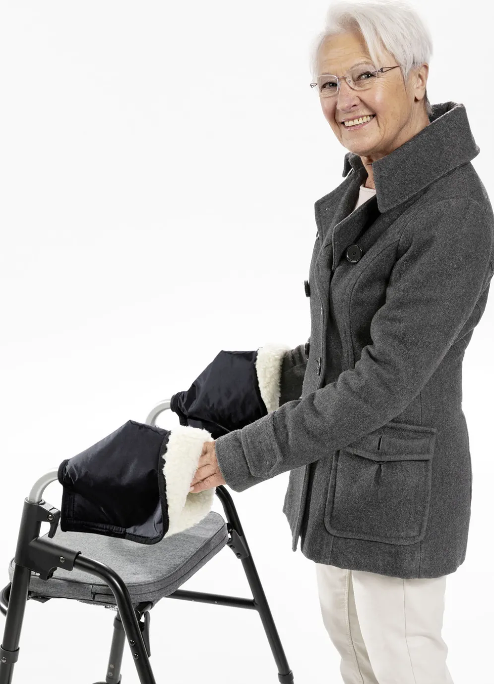 Rollator-Handschuhe aus Schurwolle sind eine Erleichterung in der kalten Jahreszeit. Mit Druckknopf zu befestigen. Sie halten die Hände schön warm und trocken, wenn Sie den Rollator schieben. Innen sind sie mit einem molligen, wärmenden Futter ausgekleidet. Die Außenseite hält Wind und Regen ab. So kommen Sie gut durch Herbst und Winter. Sie lassen sich über alle üblichen Rollatorengriffe überstülpen. Futter: 100% Schurwolle. Außenmaterial: 100% Polyamid, PU-Beschichtung. Maße: ca. B32xH22 cm