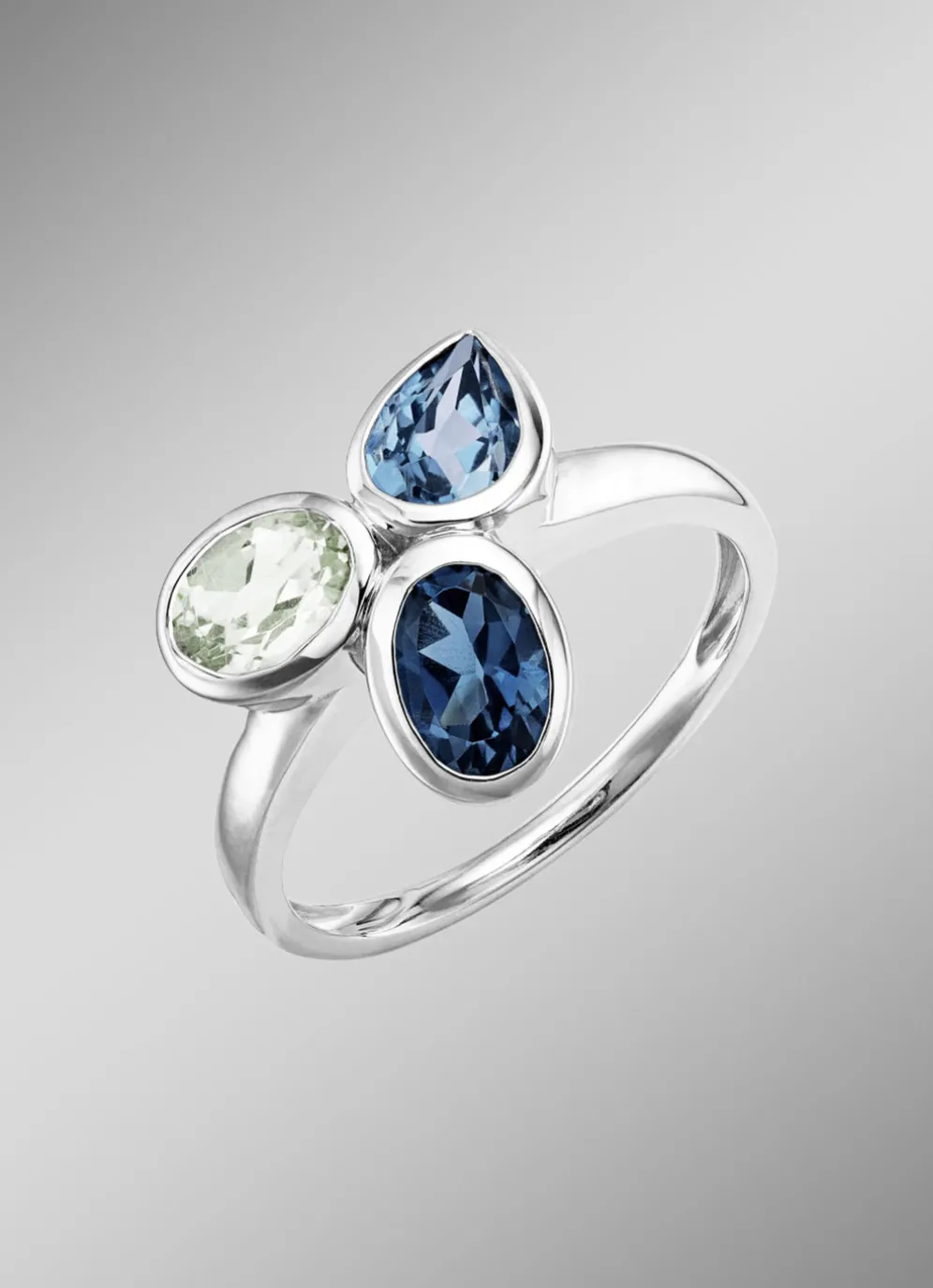 Dieser Damenring aus Silber 925/- fein verbindet Eleganz und Farbvielfalt in einem einzigartigen Design. Der facettierte Blautopas, der Blautopas in London Blue und der echte grüne Amethyst schaffen ein faszinierendes Farbspiel, das alle Blicke auf sich zieht. Mit einem Ringkopf von 13,5 mm Breite ist dieser Ring das perfekte Accessoire, um Ihrem Outfit eine besondere Note von Luxus und Raffinesse zu verleihen.