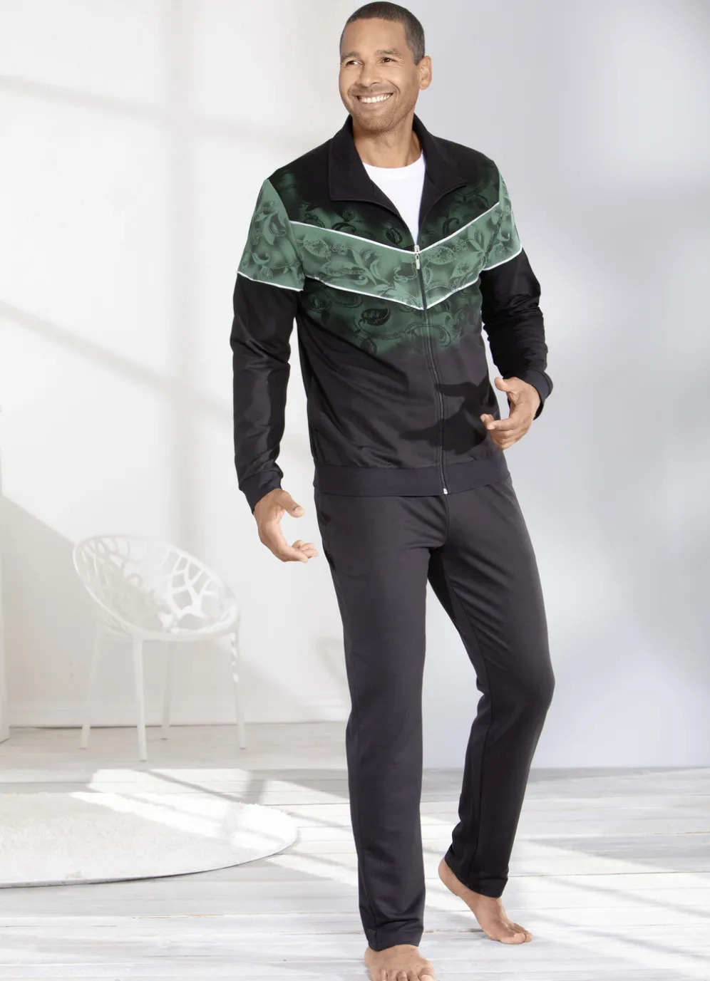 Hausanzug in Schwarz-Grün! Oberteil mit durchgehendem Reißverschluss, trendiger Druck mit Paspelierung im Vorderteil, zwei Seitennahttaschen sowie elastische Abschlüsse an den Ärmeln und am Saum.