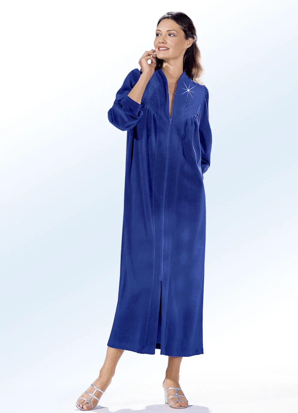 Ideal für kühlere Tage eignet sich dieser knöchellange Hausmantel mit Kelchkragen, durchgehendem Reißverschluss, strassverzierter, abgesteppter Vorderpasse, Raffung vorne, am Ansatz der langen Raglanärmel mit Bündchenabschlüssen und an der Rückenpasse, Seitennahttasche sowie innerem Rückensattel.