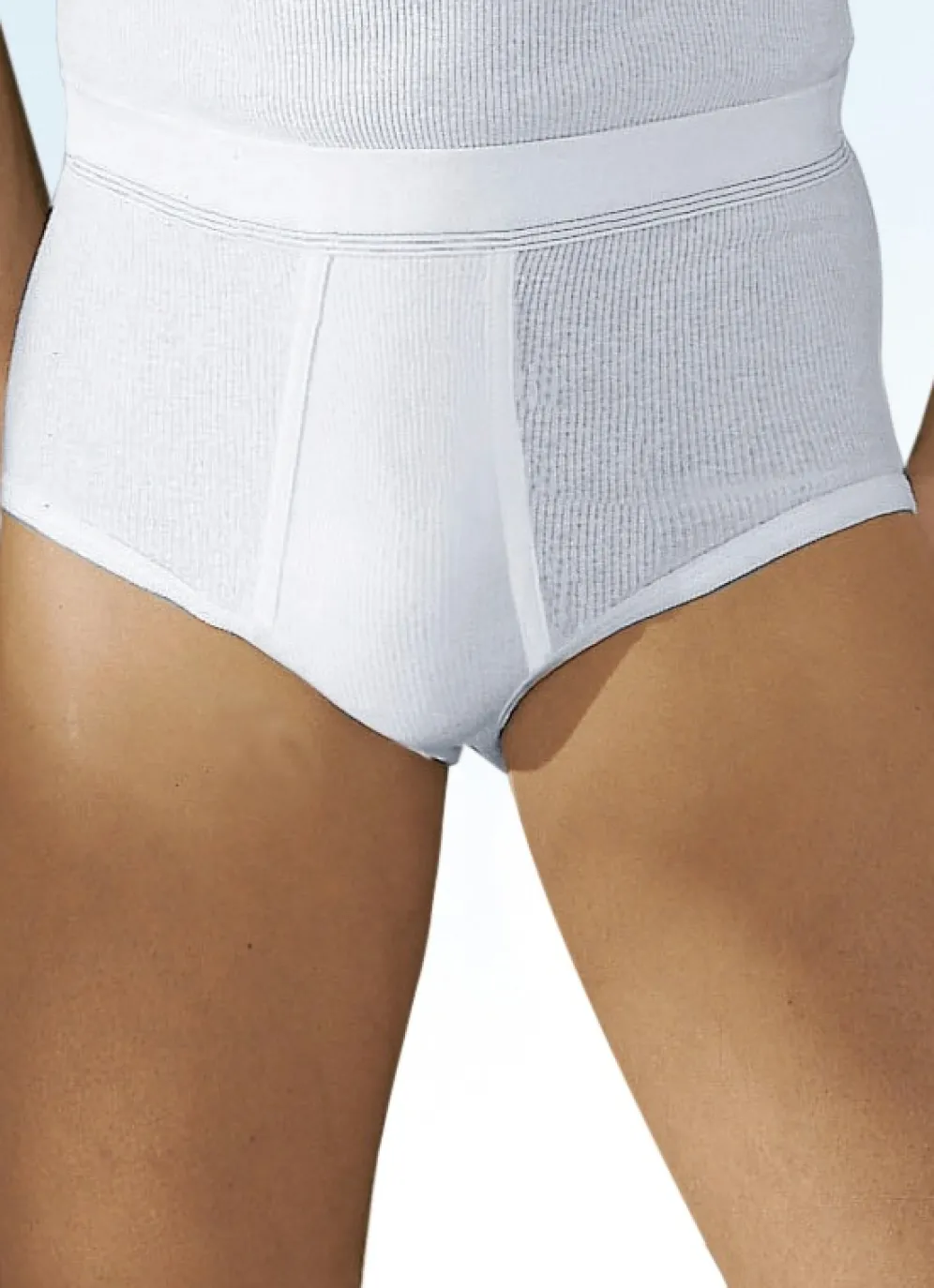 Weiße Wäsche von „Hermko“: Slip mit Kontrastnähten am Softbund und paspeliertem Eingriff.