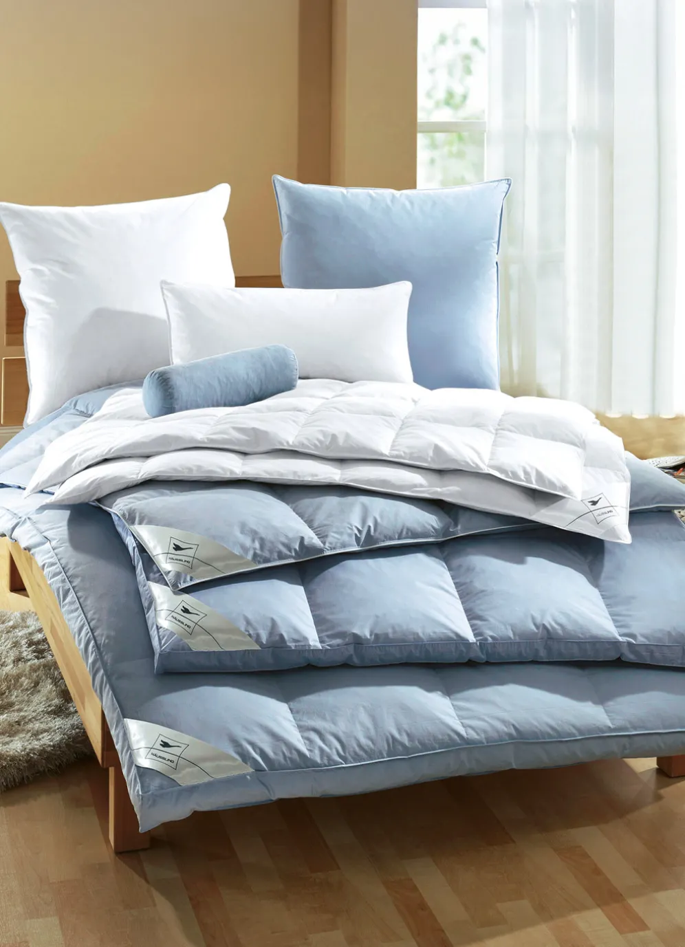 Herrlich warme Federbetten aus dem Hause Häussling in der Ausführung Medium, in Größe 125 (Nackenrolle 40/ 15 cm) sowie in Saphir.