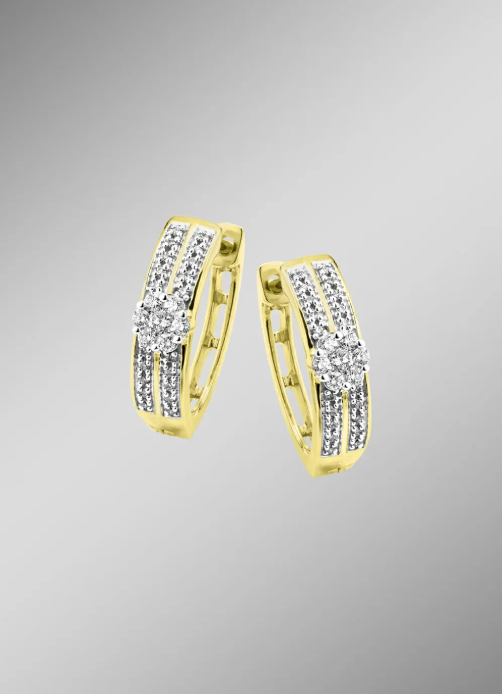 Dieser Ohrschmuck ist ein zeitloses Schmuckstück! Hochwertige Creolen mit 14 Brillanten und 40 Diamanten in Weiß, zus. ca. 0,25 ct., in der Reinheit SI. In 585/- feinem Gold gefasst. Zurückhaltend und elegant lassen sich diese 15 mm langen Ohrringe unendlich kombinieren und garantieren stets einen stilsicheren Auftritt.