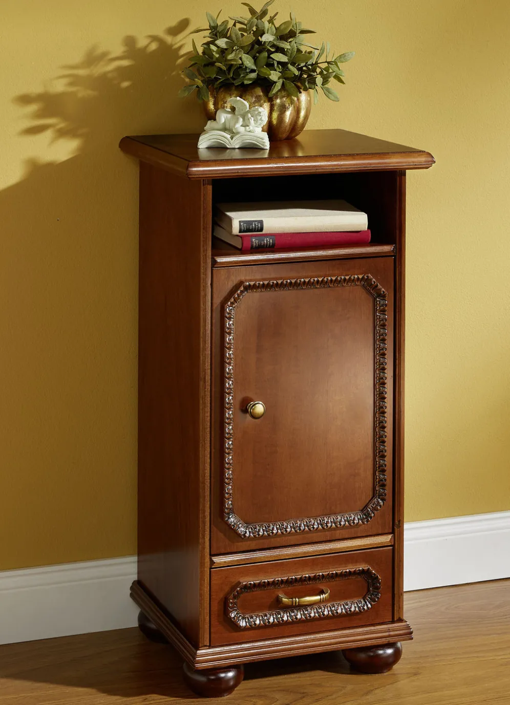 Kommode, 1-türig: Mit 1 Tür, darunter 1 Schublade, darüber 1 offenes Fach. Maße: B36xH71,5xT29 cm