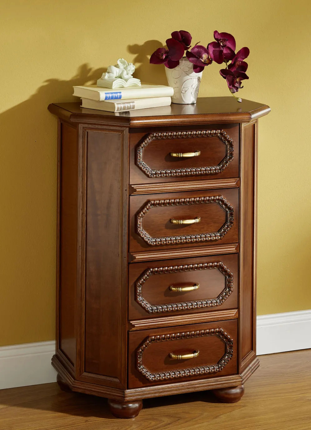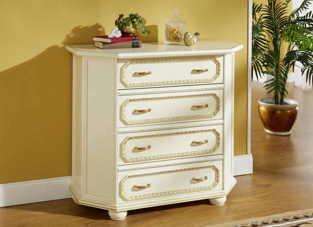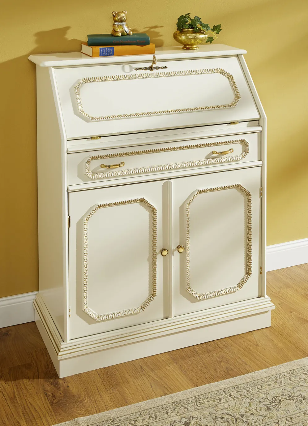 Diese hochwertige Möbelserie mit Echtholzfurnier besticht durch ihre kunstvolle Verarbeitung mit reichhaltigen Verzierungen und schicken goldfarbenen Metallgriffen/-knöpfen. Die Lieferung erfolgt aufgebaut