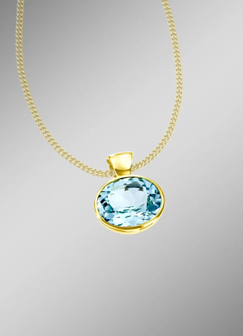 Damit Ihnen überall bewundernde Blicke folgen, kommt dieser massive Anhänger ins Spiel, den ein behandelter Topas ziert. Dieser zauberhafte, ovale Edelstein mit den Maßen 13×11 mm ist ein sehr attraktiver Blautopas.