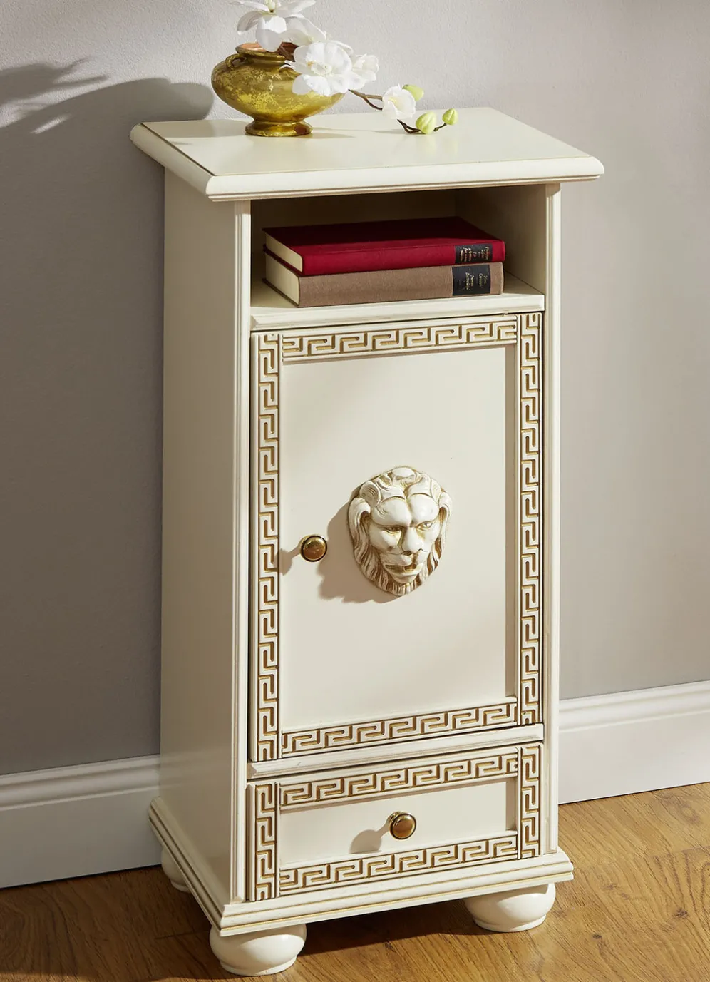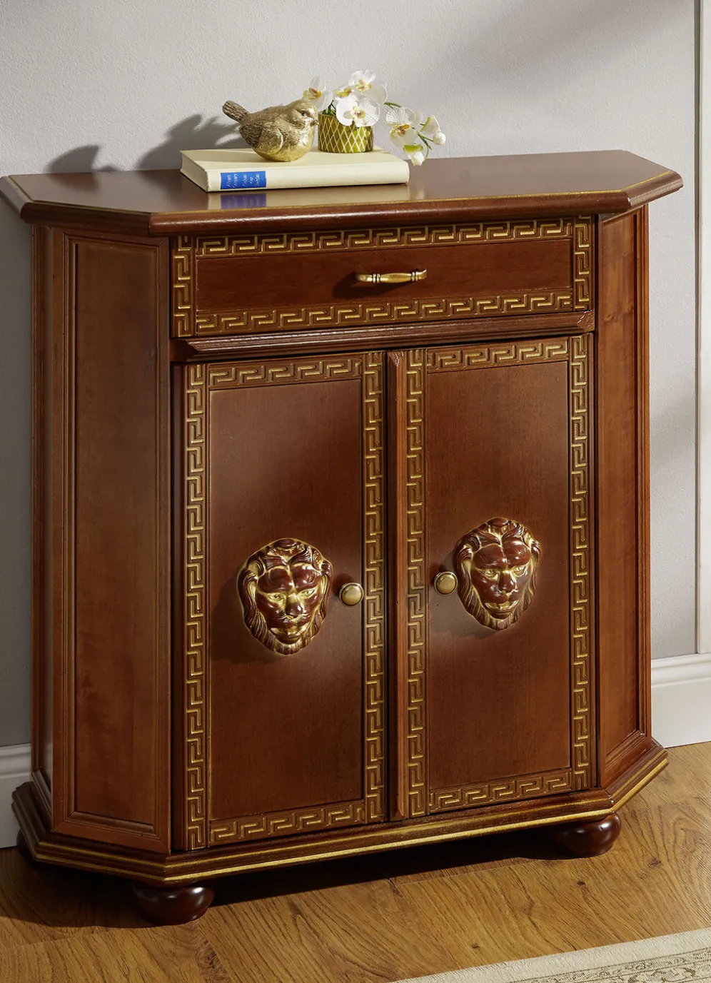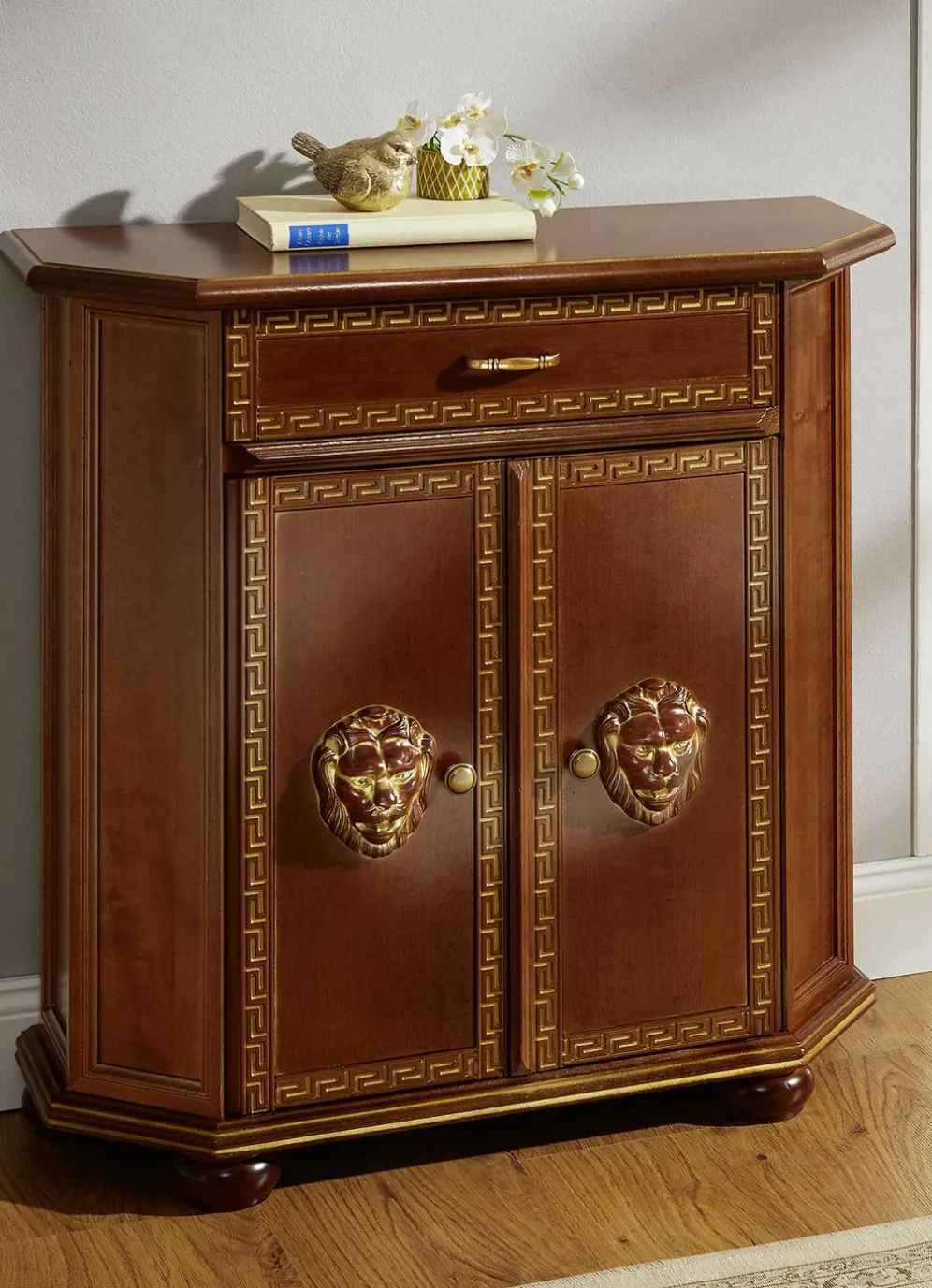 Hochwertiges Möbelprogramm mit Verzierungen in der Ausführung Kommode, 1-türig und in Nussbaum-Gold.